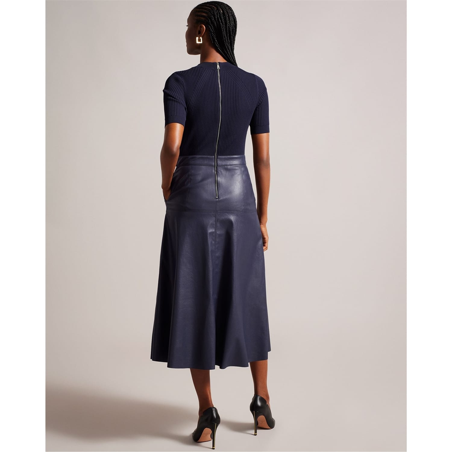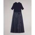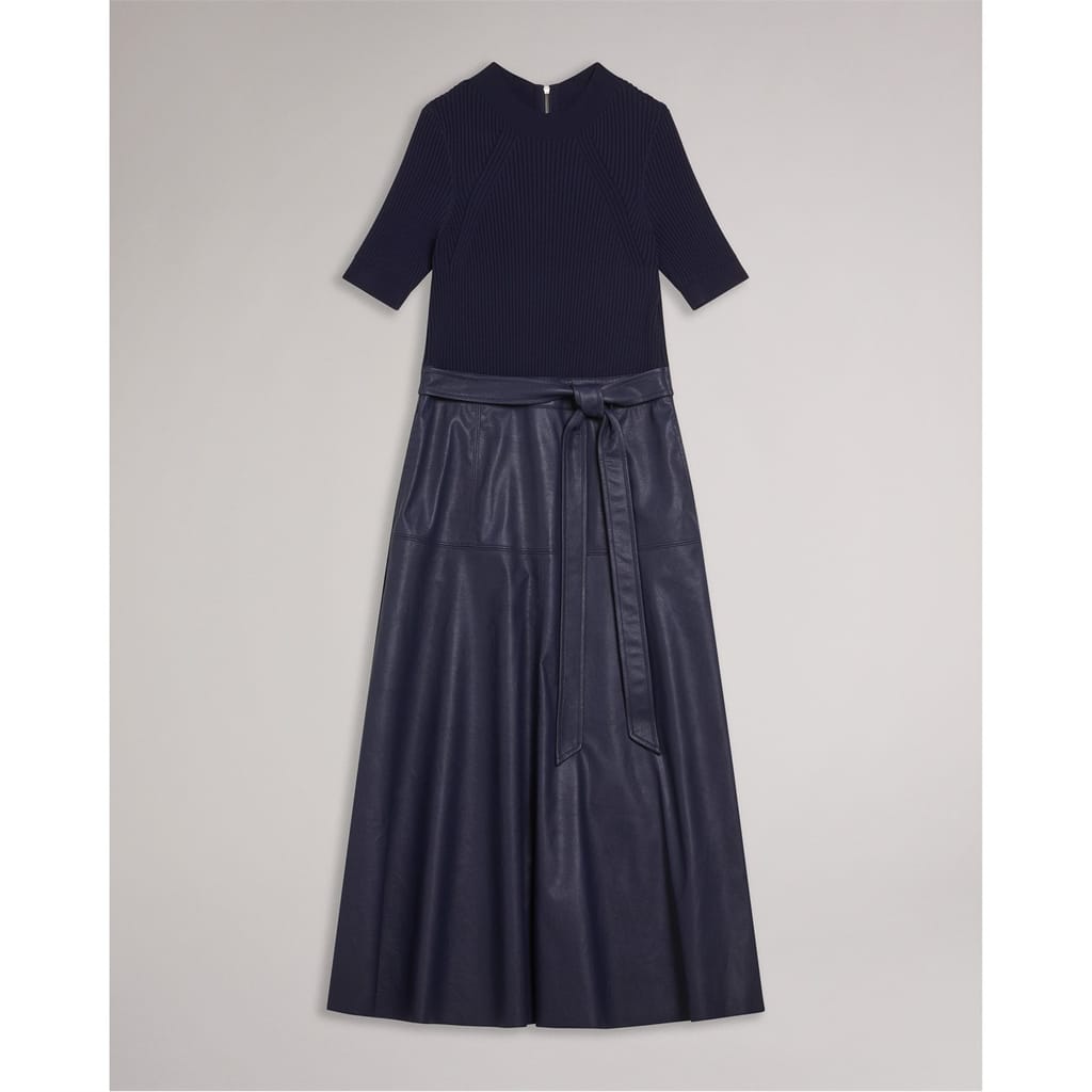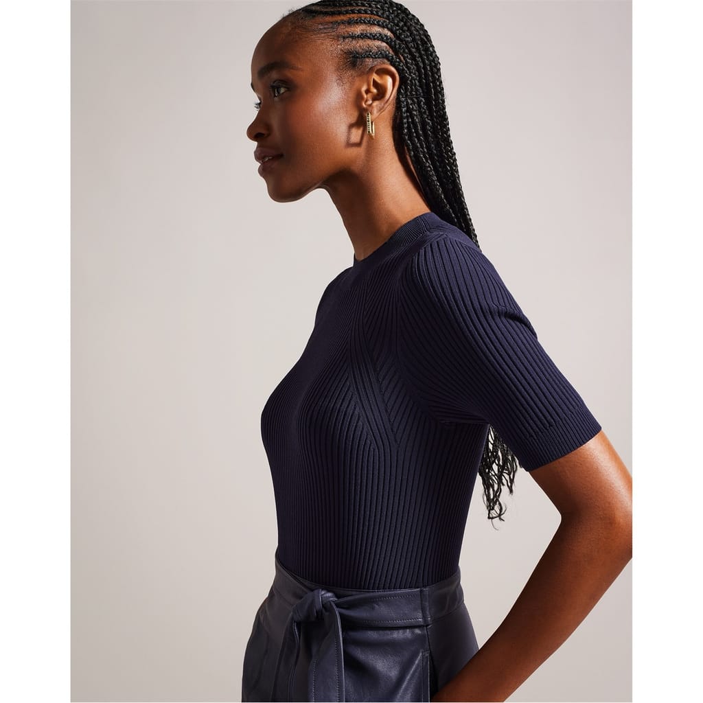 This Ted Baker midi dress features a mock neck and a ribbed pattern, offering a sophisticated look. The A-line design ensures a flattering silhouette, while the short sleeves and straight hem add to its elegance. A tie closure provides a secure fit, making it a versatile addition to any wardrobe. -