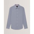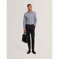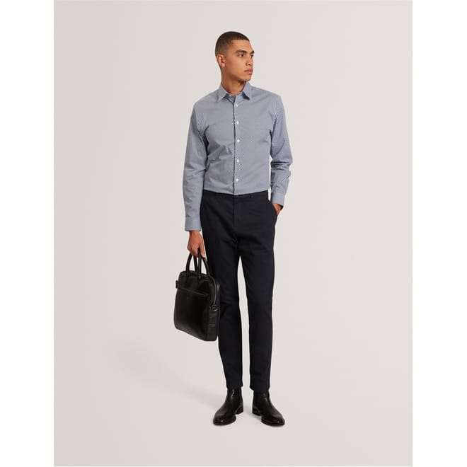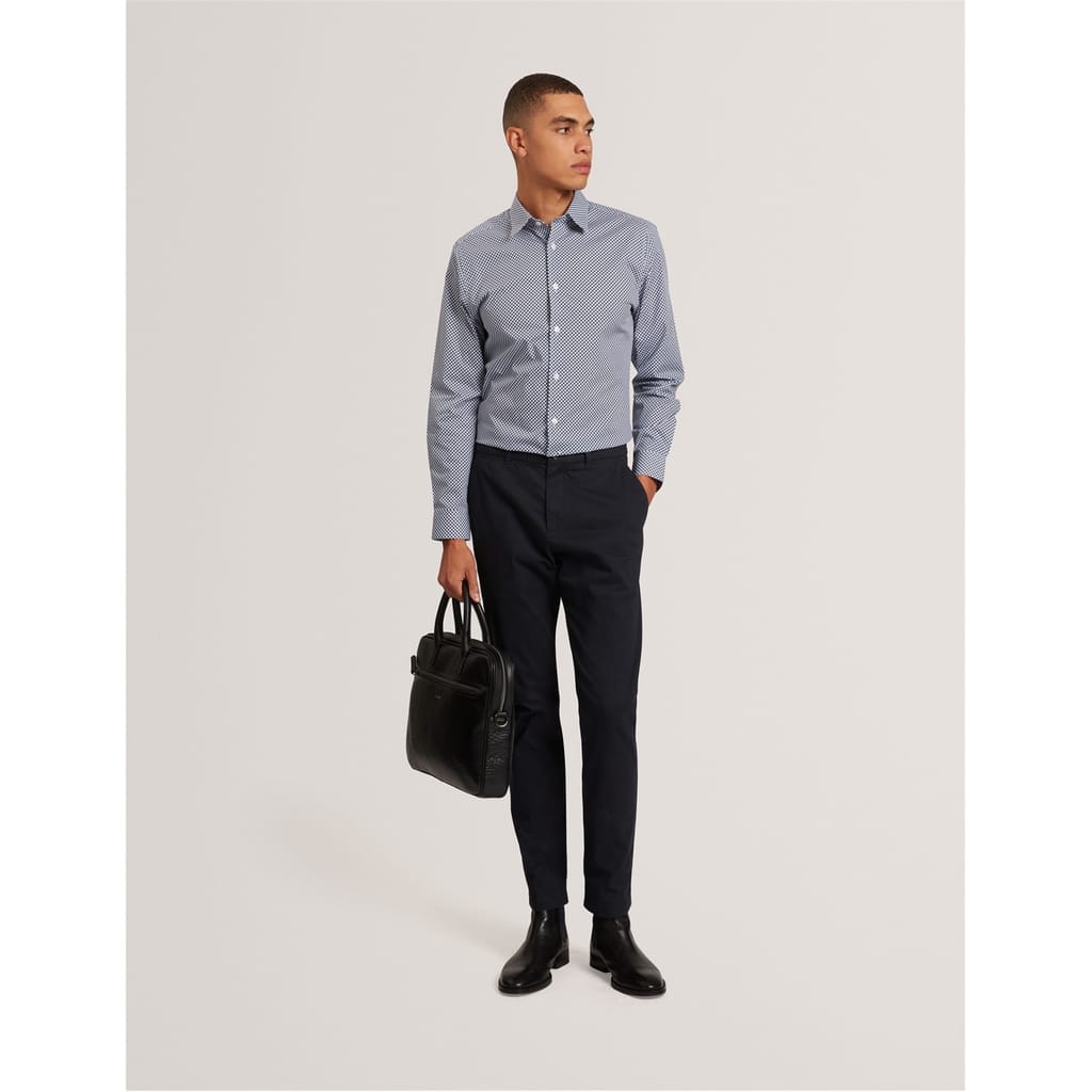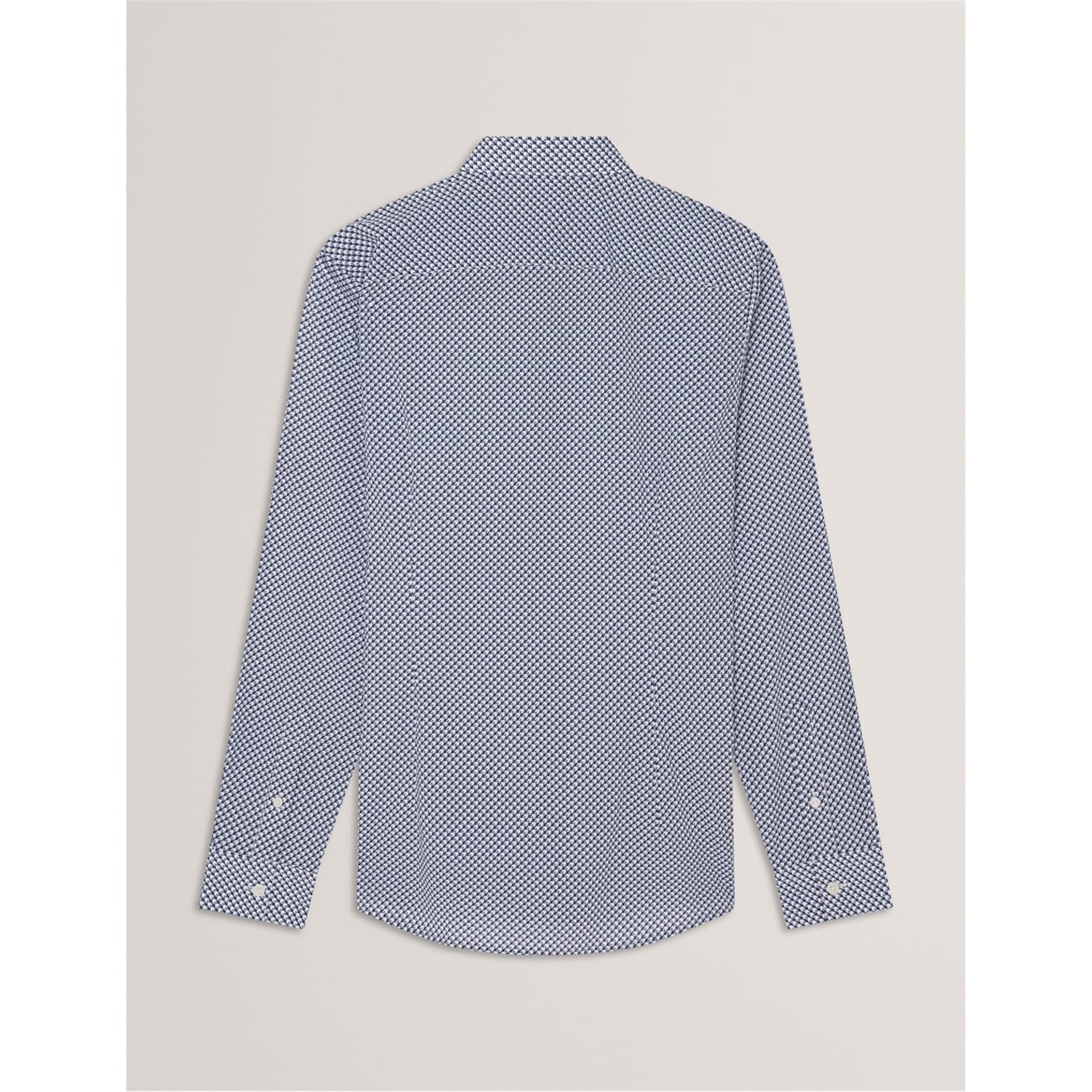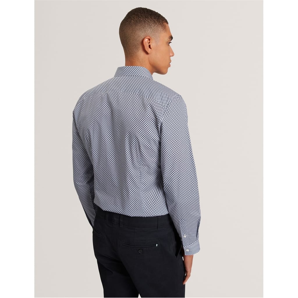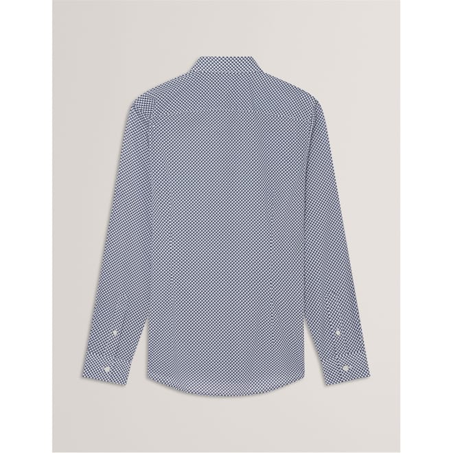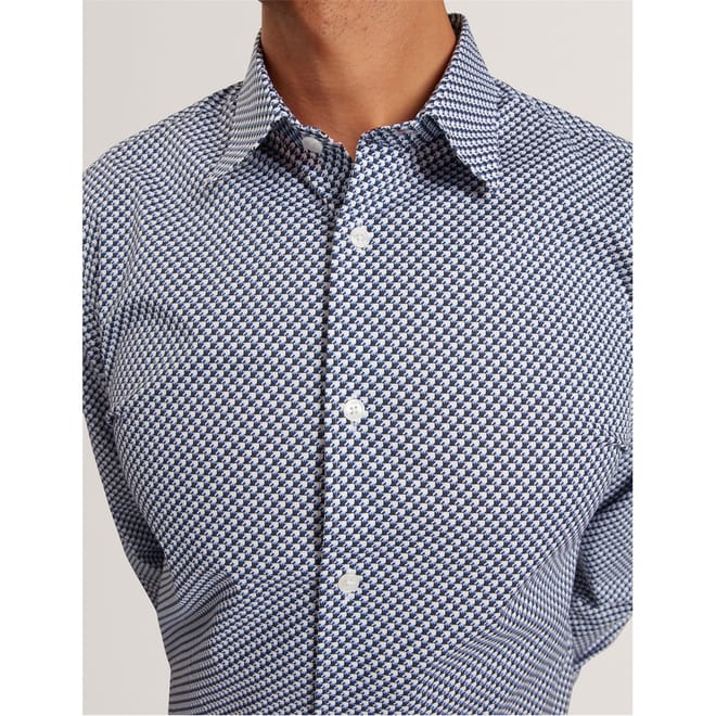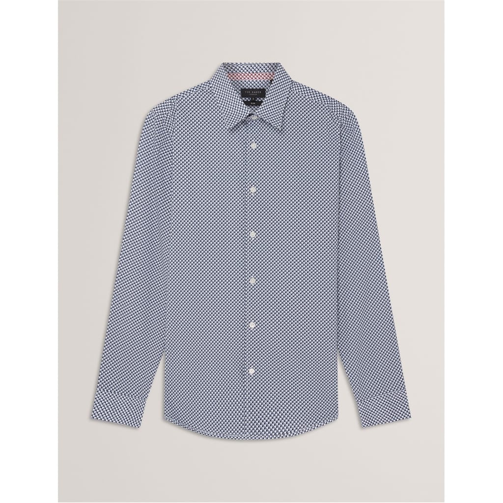 This Ted Baker top features a geometric pattern, offering a stylish and modern look. Designed with long sleeves and a shirt collar, it provides a classic touch. The regular fit ensures comfort, while the full button closure adds practicality. Finished with a barrel cuff, this top is a versatile addition to any wardrobe. -