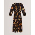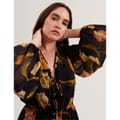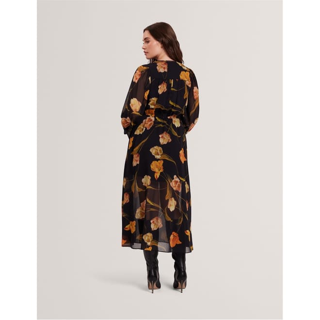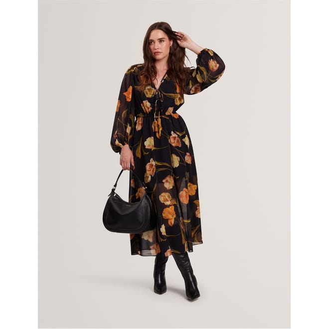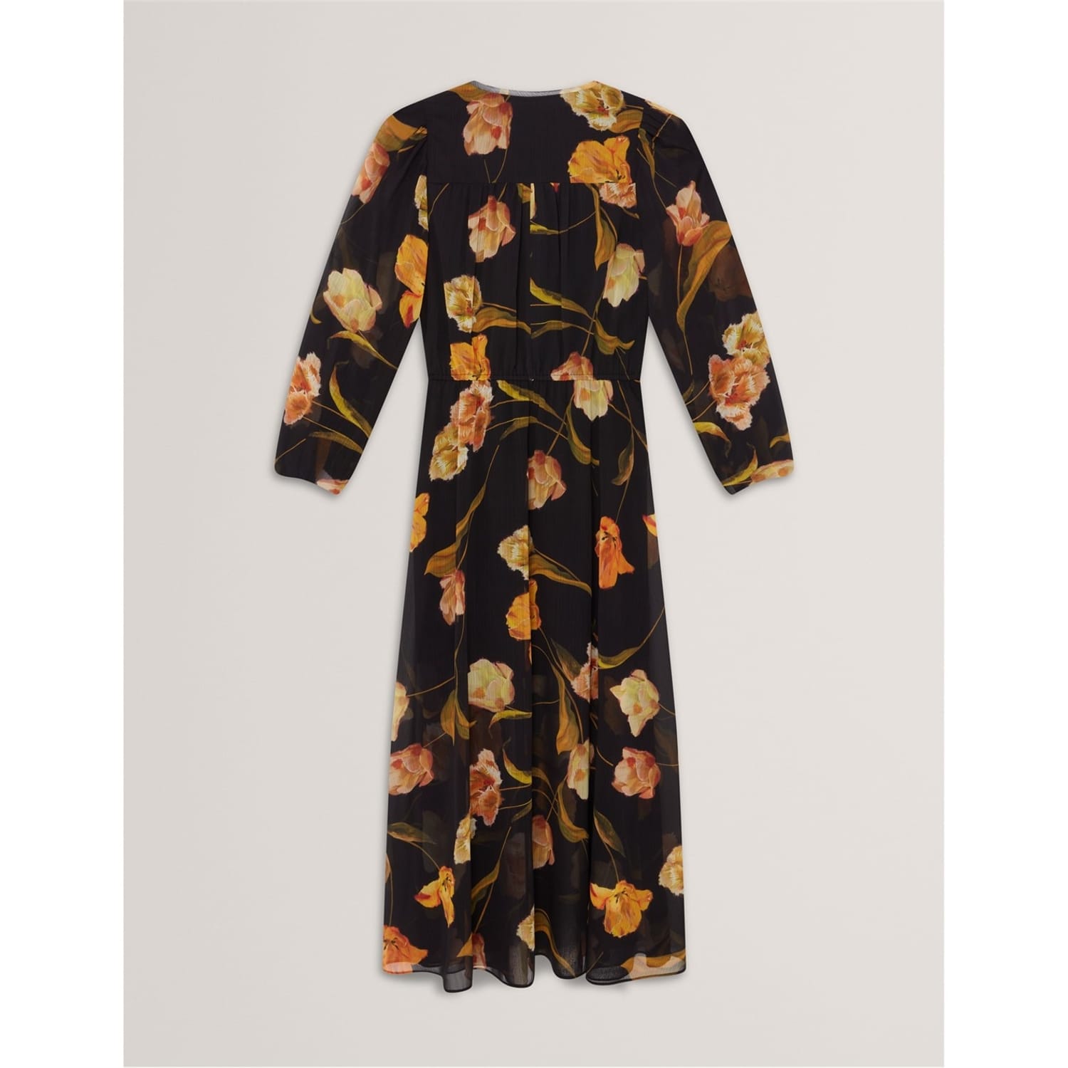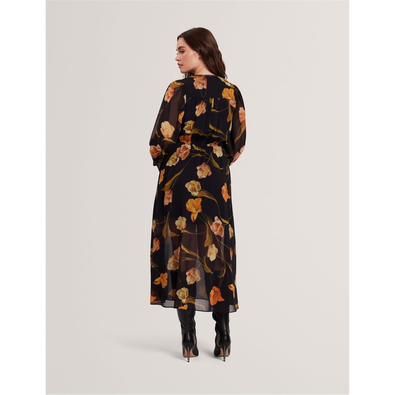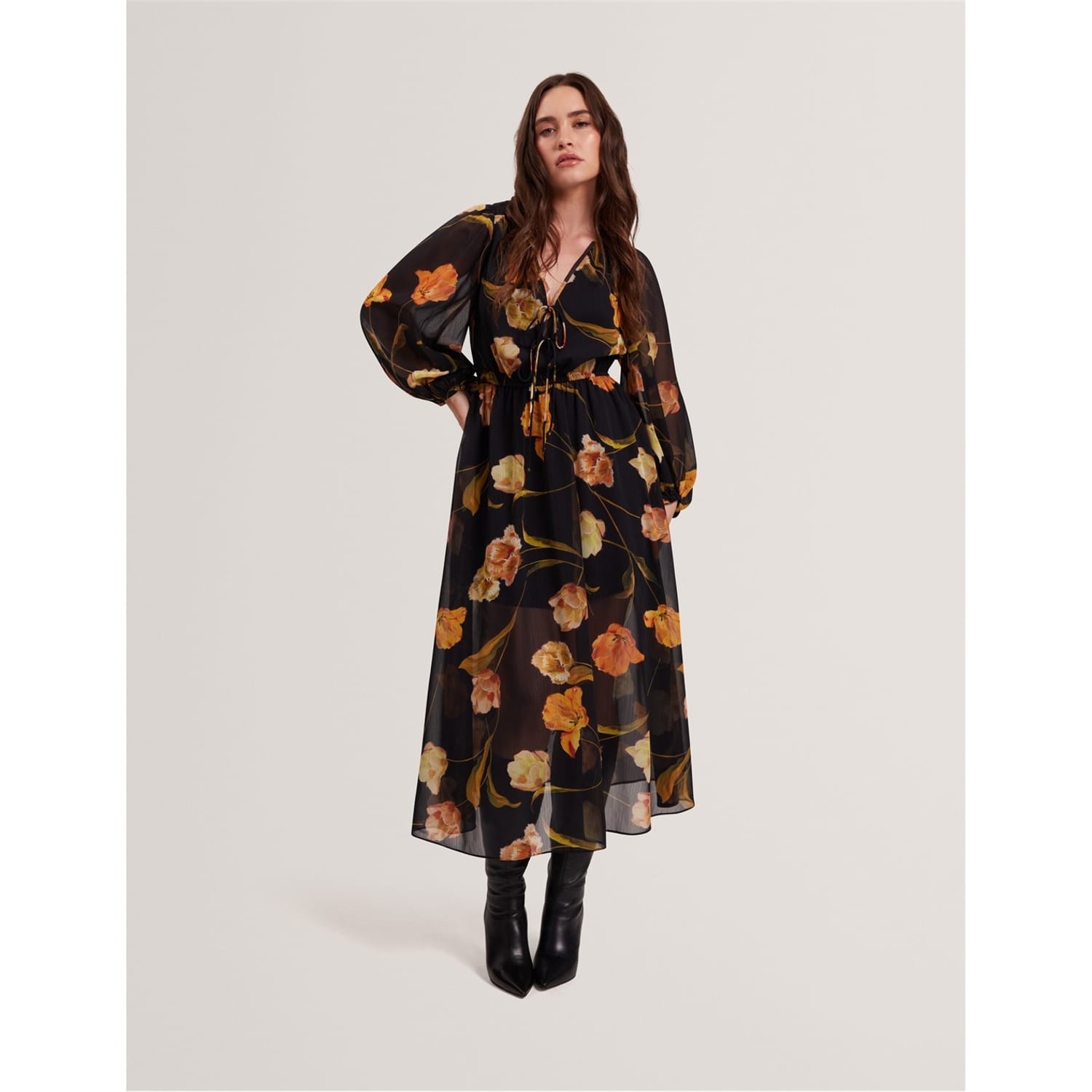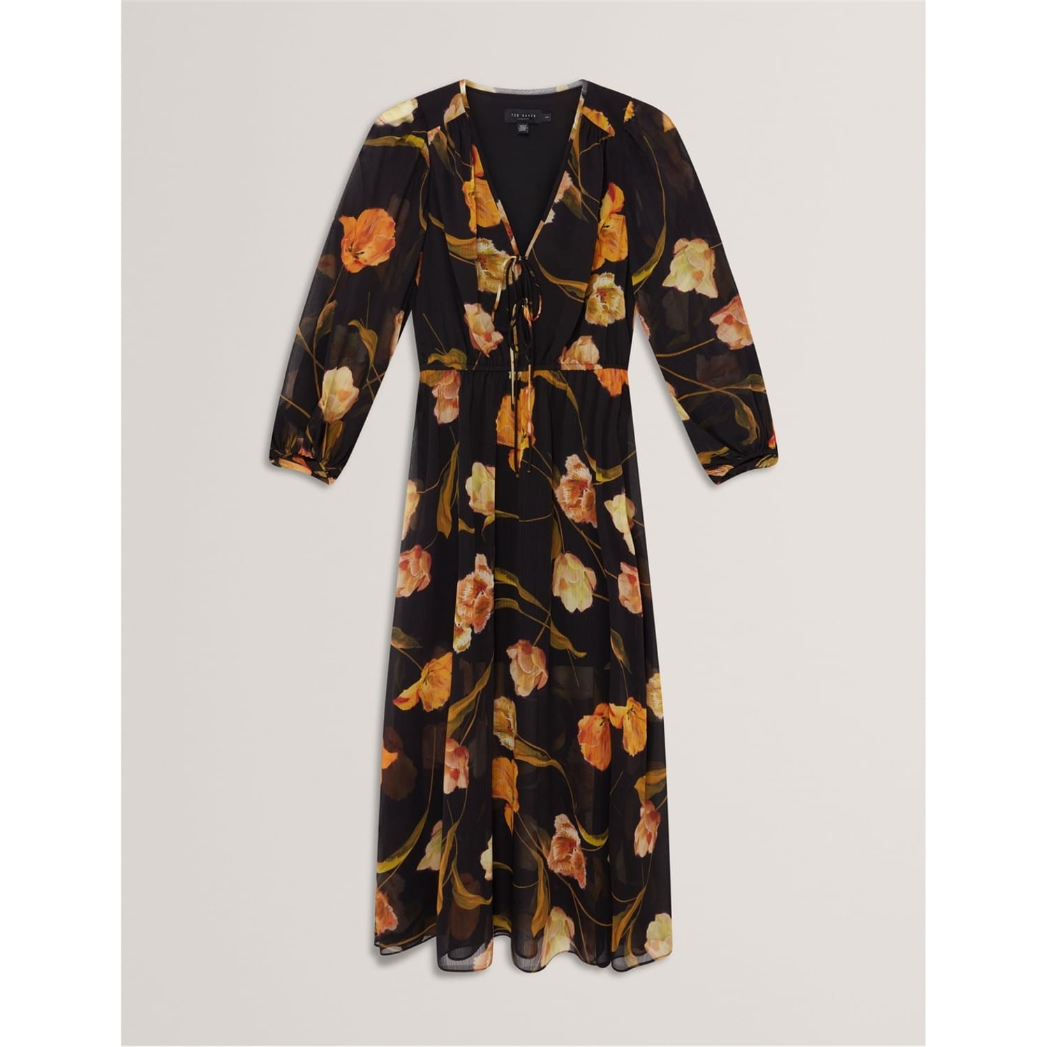 This Ted Baker midi dress is a perfect blend of elegance and style. Featuring a solid and floral pattern, it boasts a flattering A-line silhouette. The dress is designed with a V-neck and long balloon sleeves, adding a touch of sophistication. A tie closure and straight hem complete the look, ensuring a regular fit that is both comfortable and chic. -