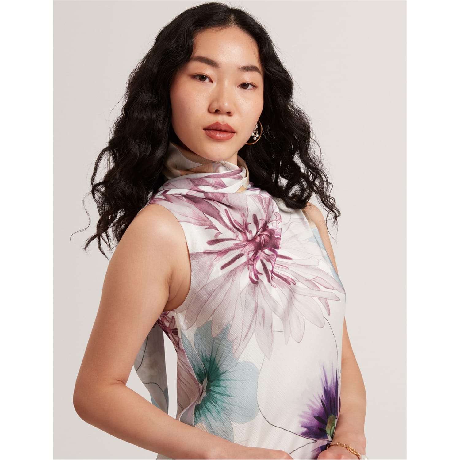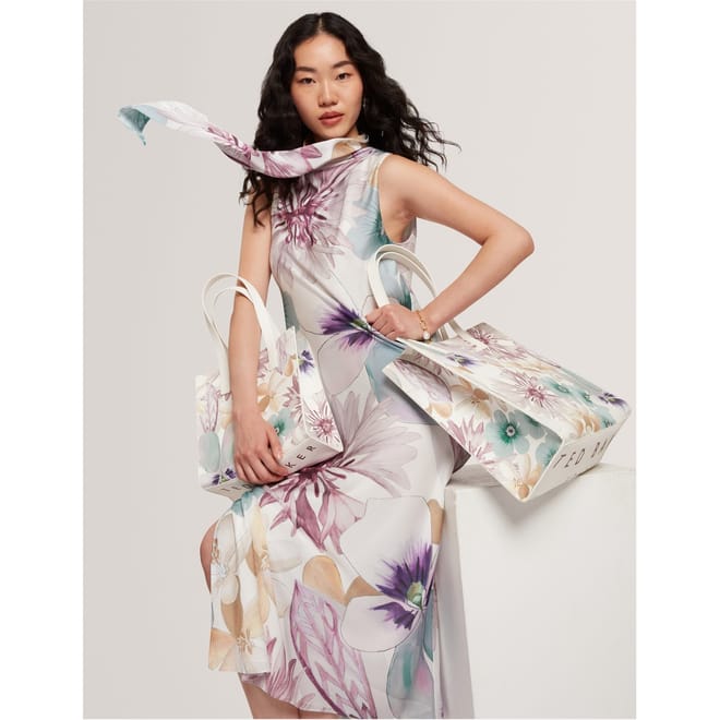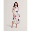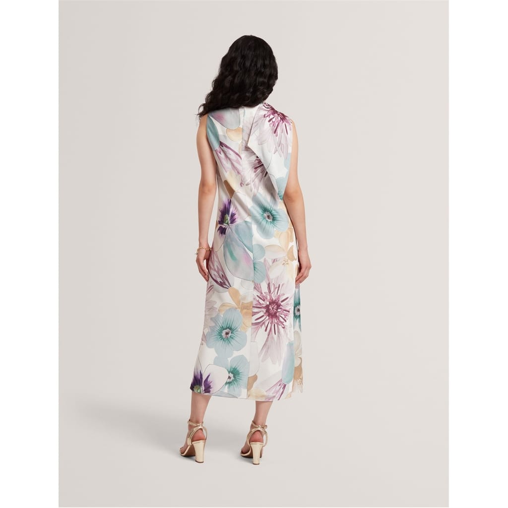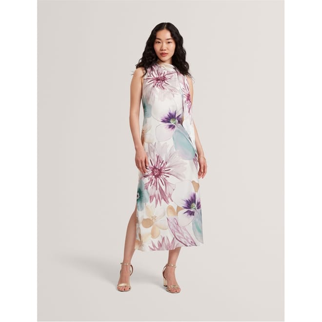 This Ted Baker sheath dress features a midi length with a high collar and a tie neck. The floral pattern adds a touch of elegance, while the straight hem provides a clean finish. Designed with a tie closure, this dress offers a sophisticated look for any occasion. -