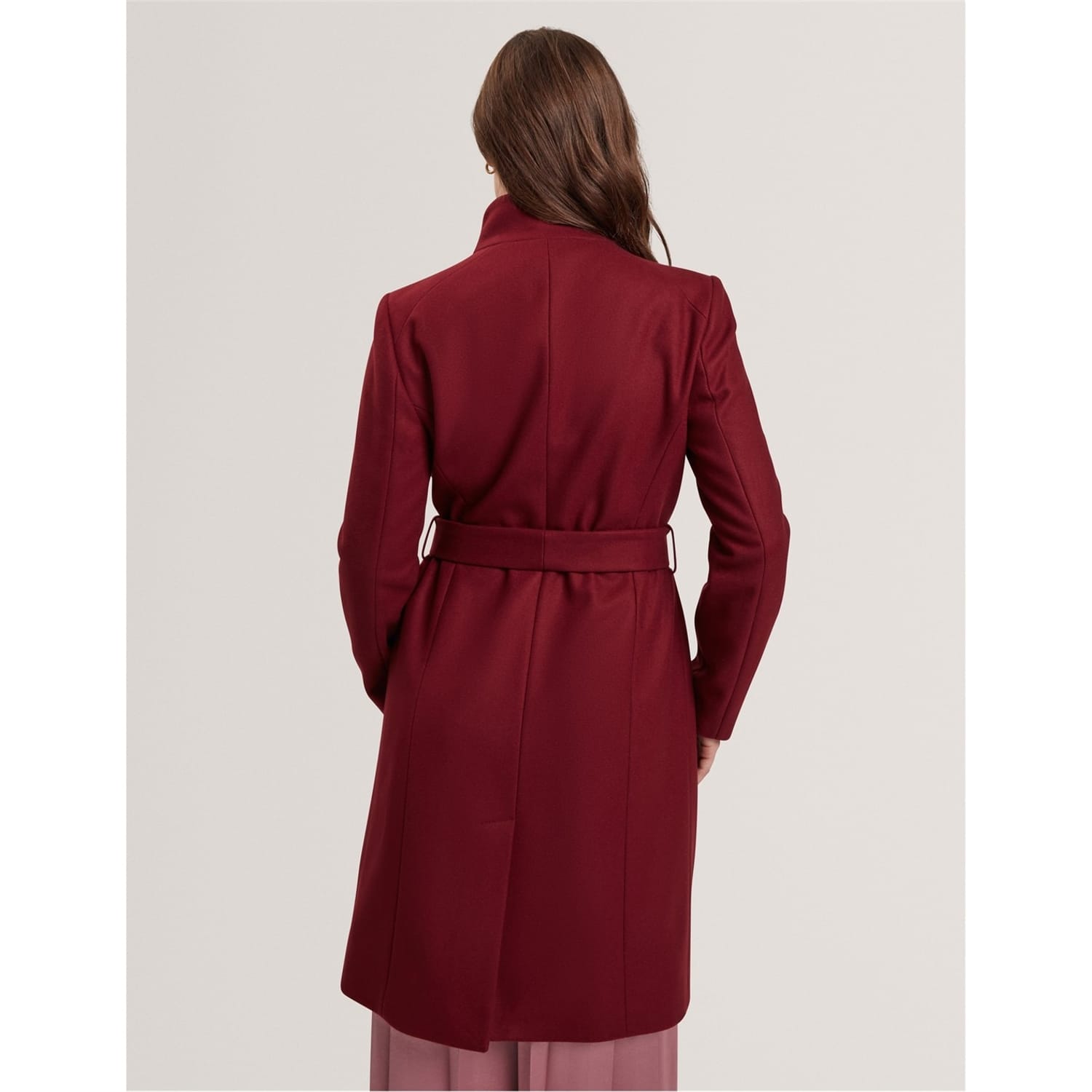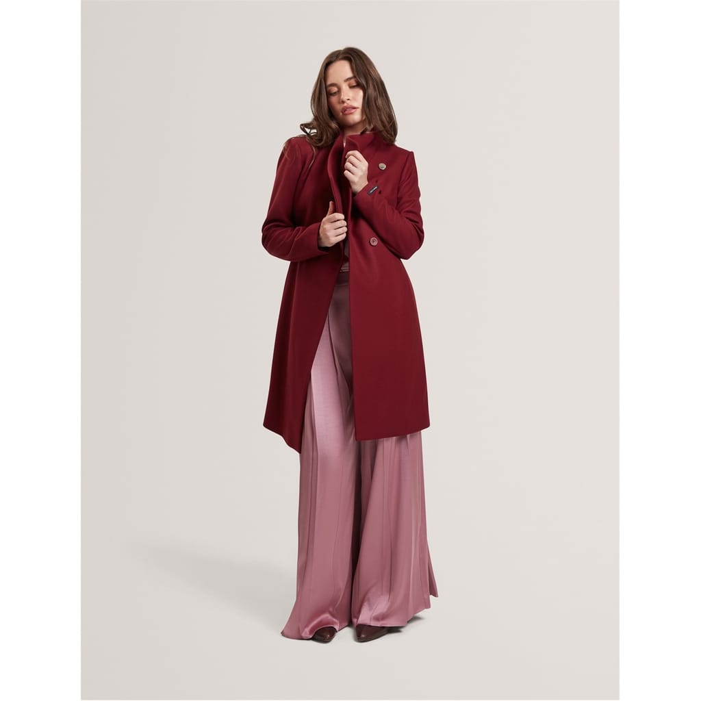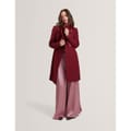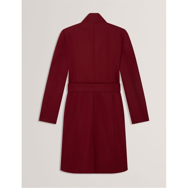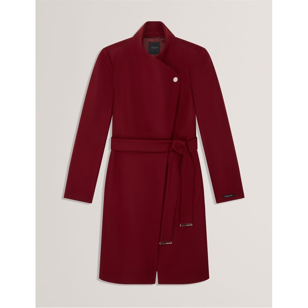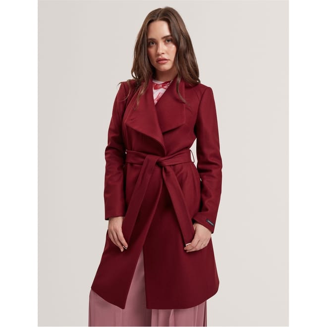 Timeless design meets modern detailing in this sophisticated midi coat from Ted Baker. Featuring an elegant wrap-style front secured with a self-tie belt, this coat creates a flattering silhouette that works for any occasion. The dramatic waterfall collar adds architectural interest, while metallic hardware accents provide a contemporary finish. Long sleeves and a midi length offer practical coverage without compromising on style.