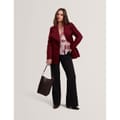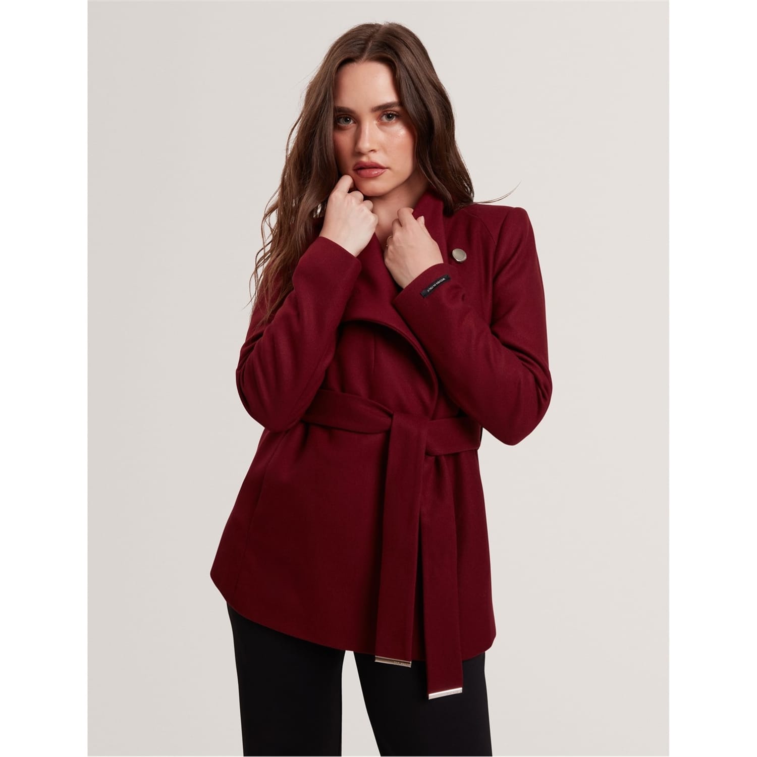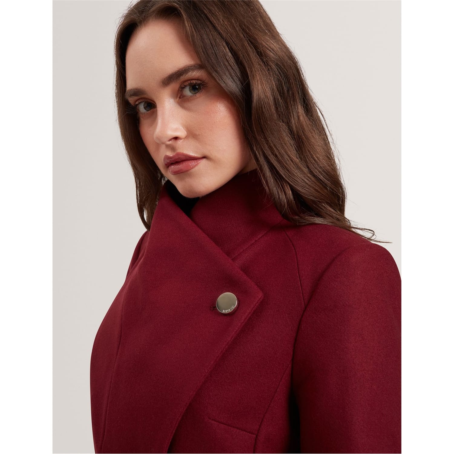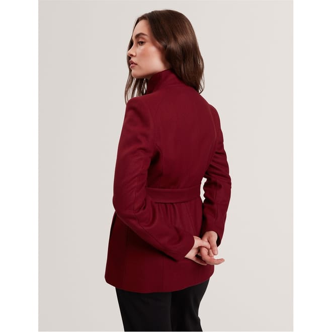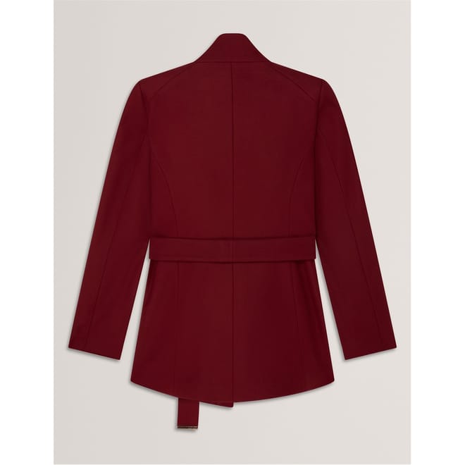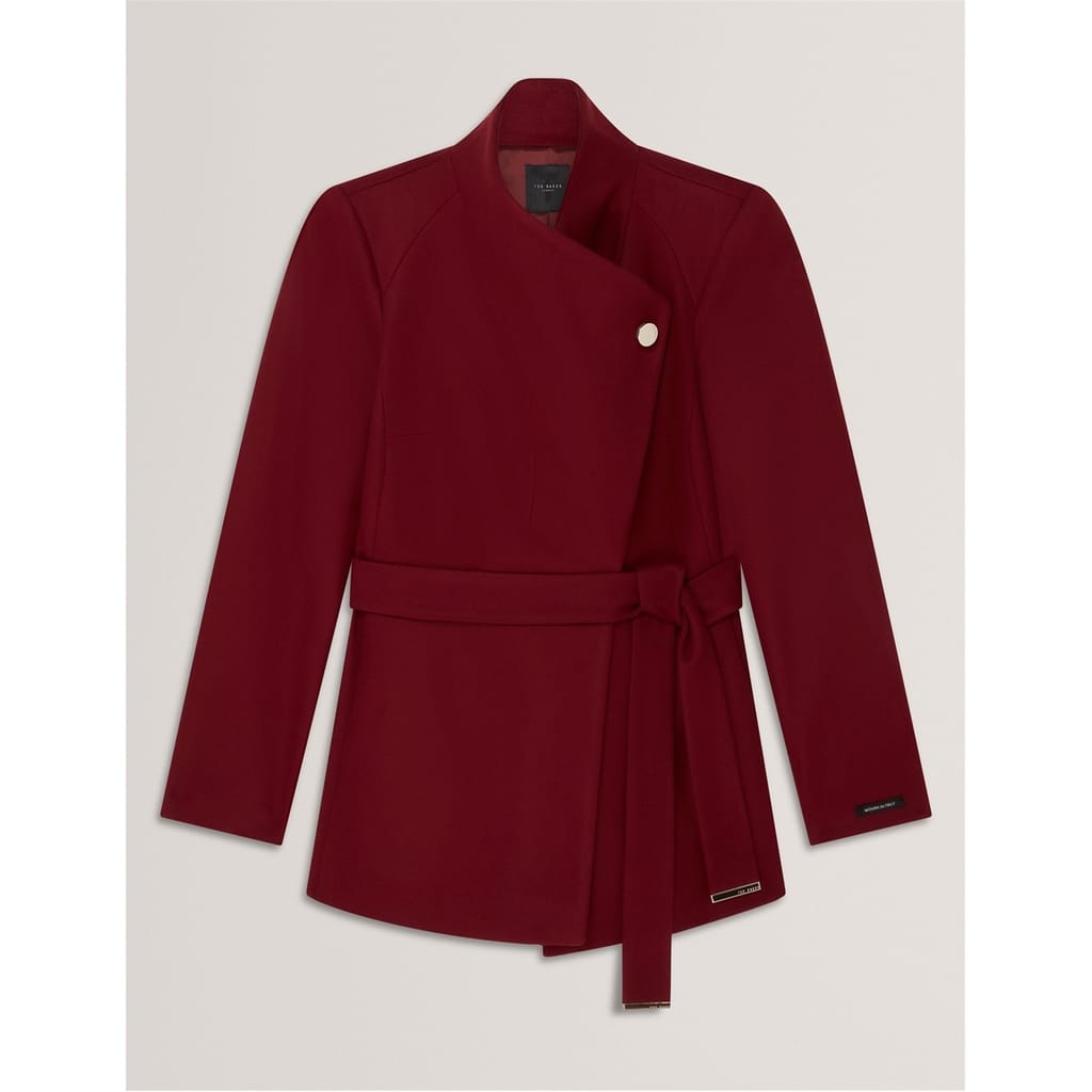 Distinguished tailoring meets modern design in this Ted Baker short overcoat. The wrap-style silhouette features a dramatic fold-over collar and metallic hardware detailing that adds a contemporary edge. A self-tie belt cinches the waist, creating a flattering shape while maintaining practicality. The clean lines and precise cut demonstrate exceptional attention to detail, from the long sleeves with branded cuff details to the practical side pockets.