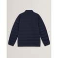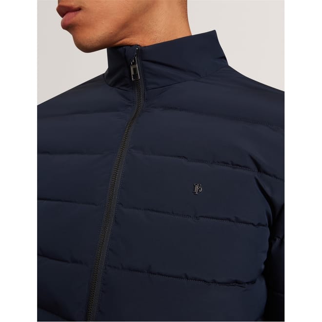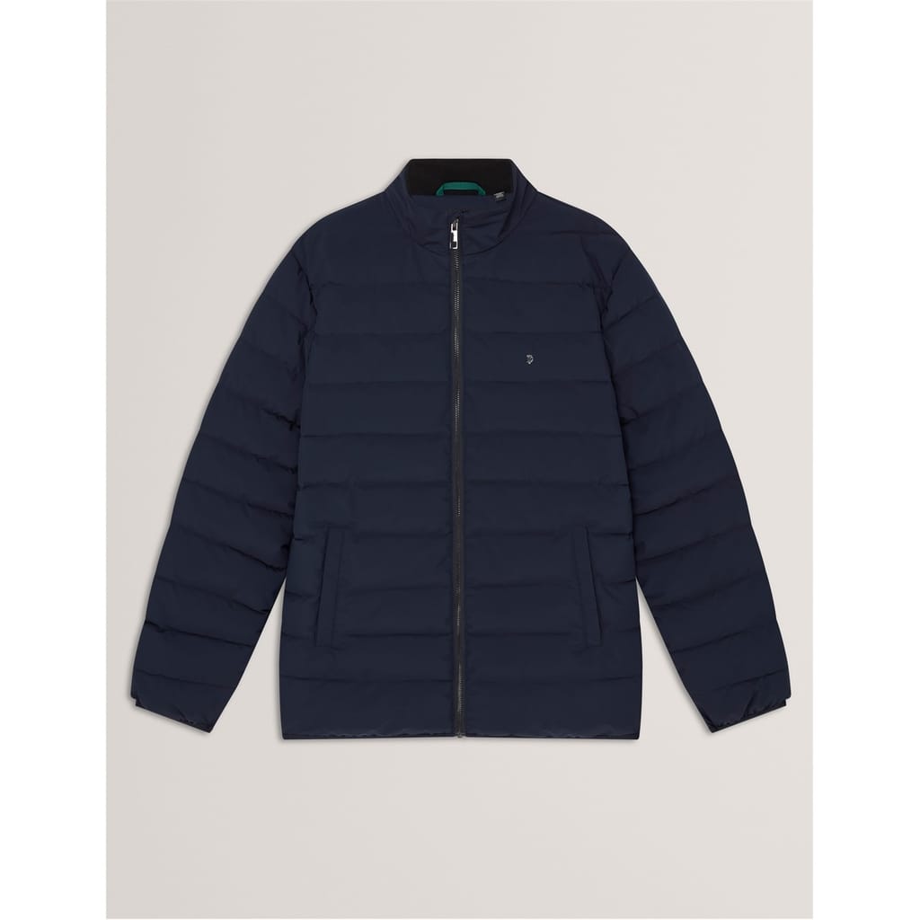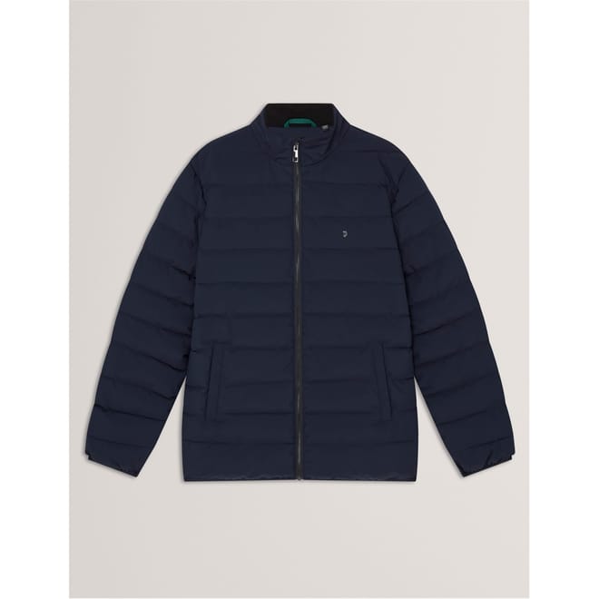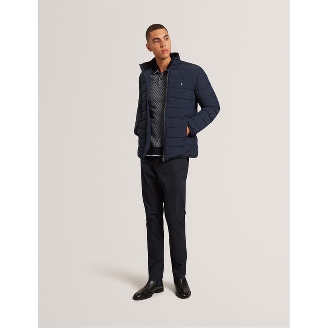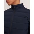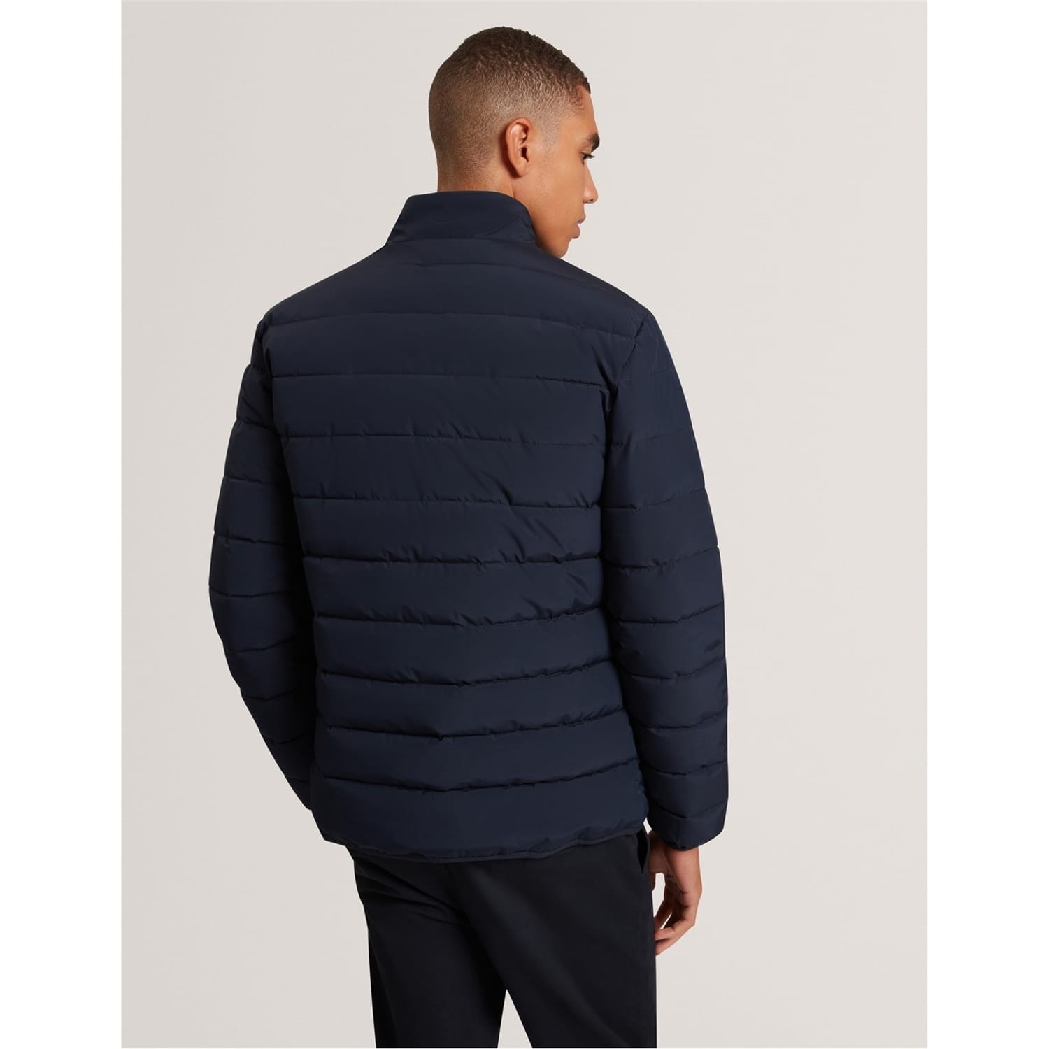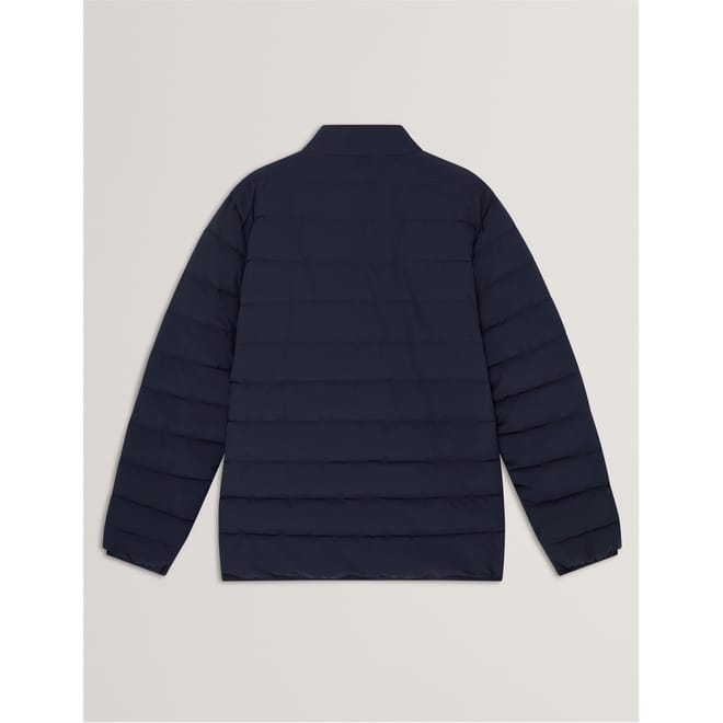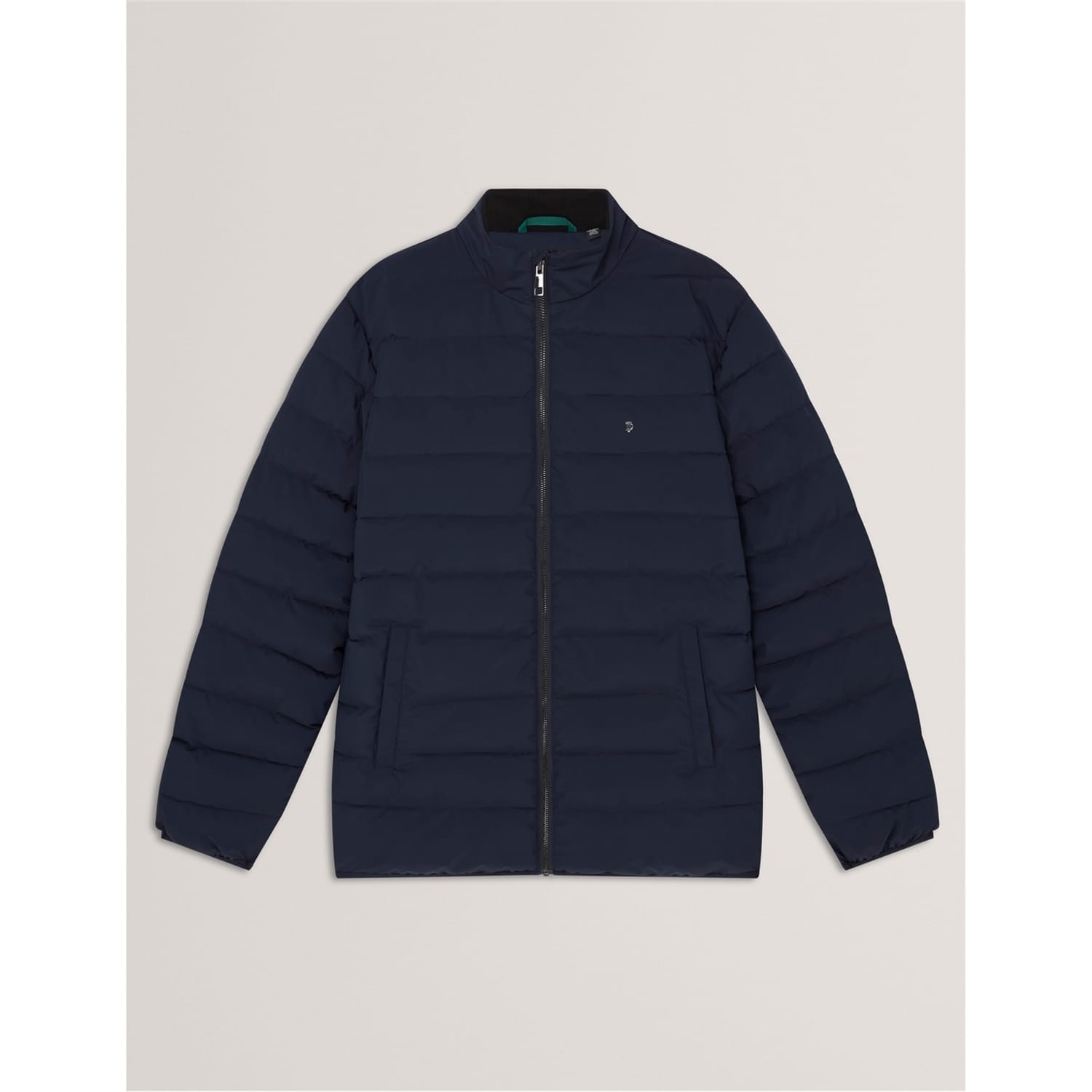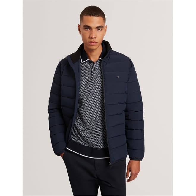Ted Baker's puffer coat is a lightweight, short jacket featuring a high collar and a straight hem. It offers a regular fit with a zipper closure and elasticated cuffs. The solid pattern is complemented by practical pockets, including a chest pocket and zipped pocket, while the metal logo adds a subtle touch of branding. -