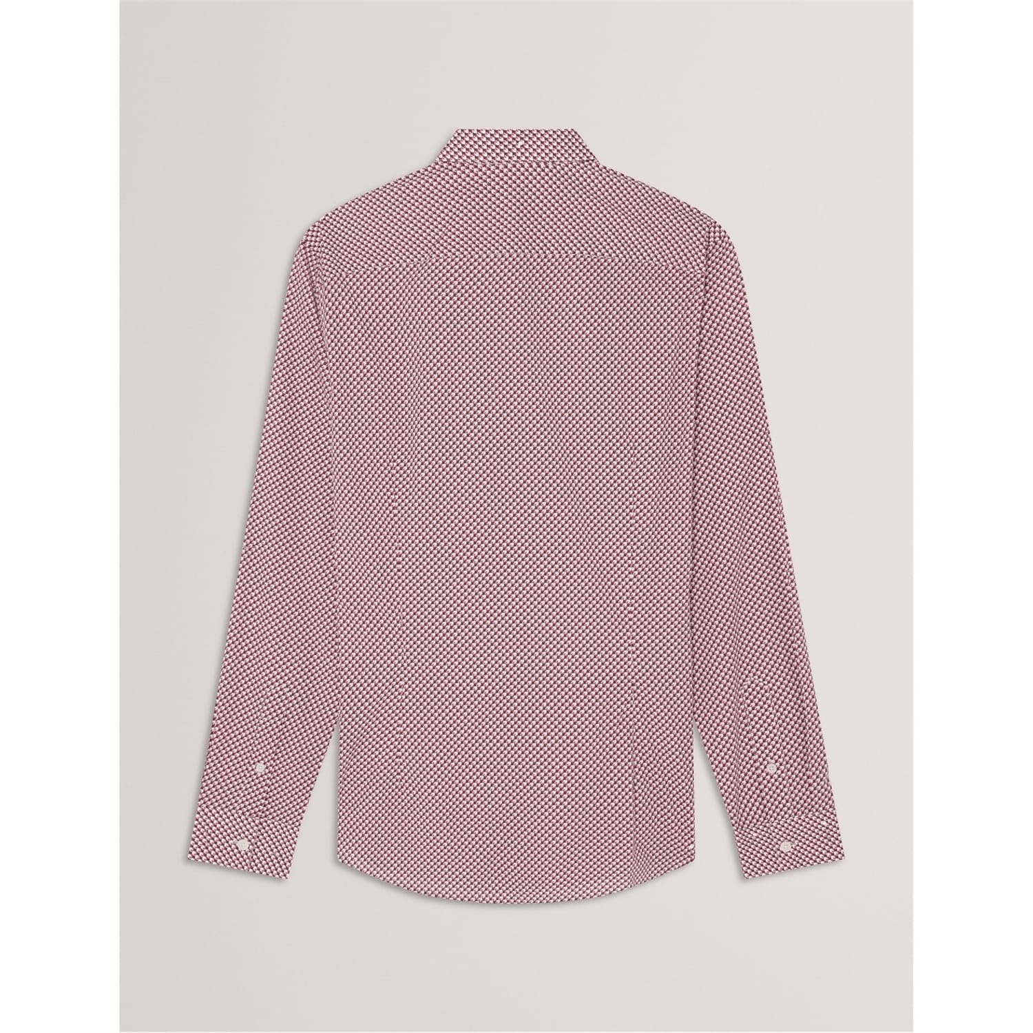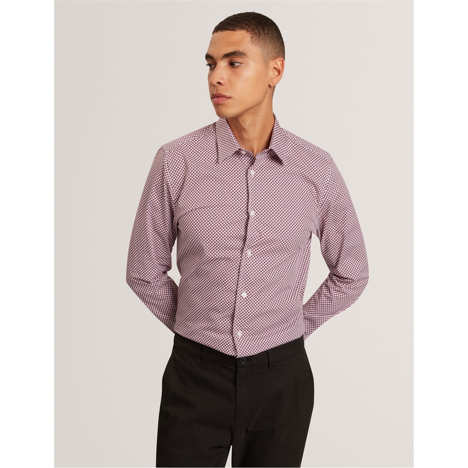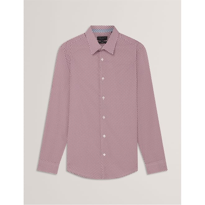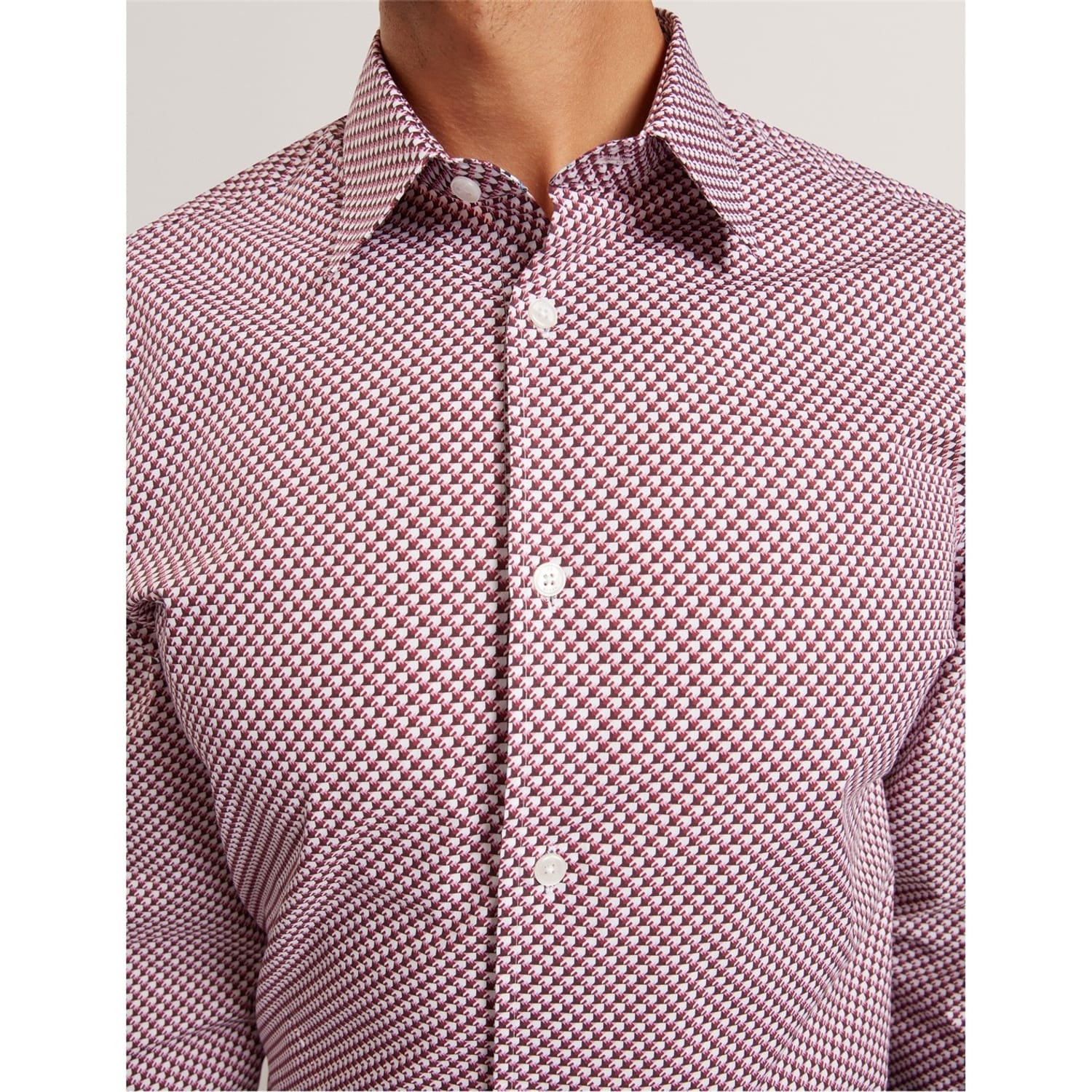 This Ted Baker top features a geometric pattern, offering a stylish and modern look. Designed with long sleeves and a shirt collar, it provides a classic touch. The regular fit ensures comfort, while the full button closure and button placket add functional elegance. Finished with barrel cuffs, this top is a versatile addition to any wardrobe. -