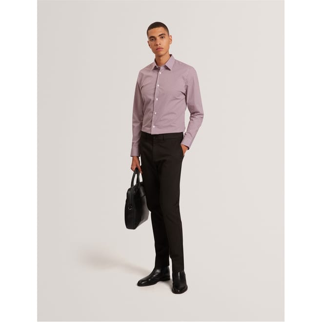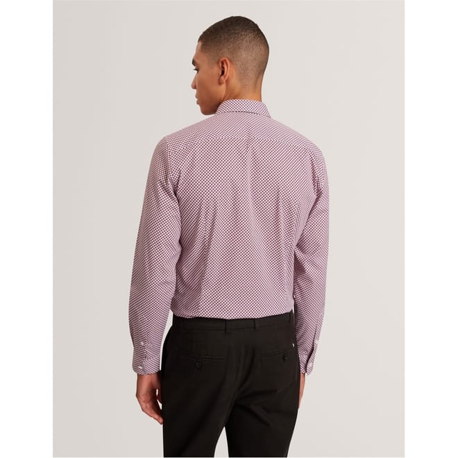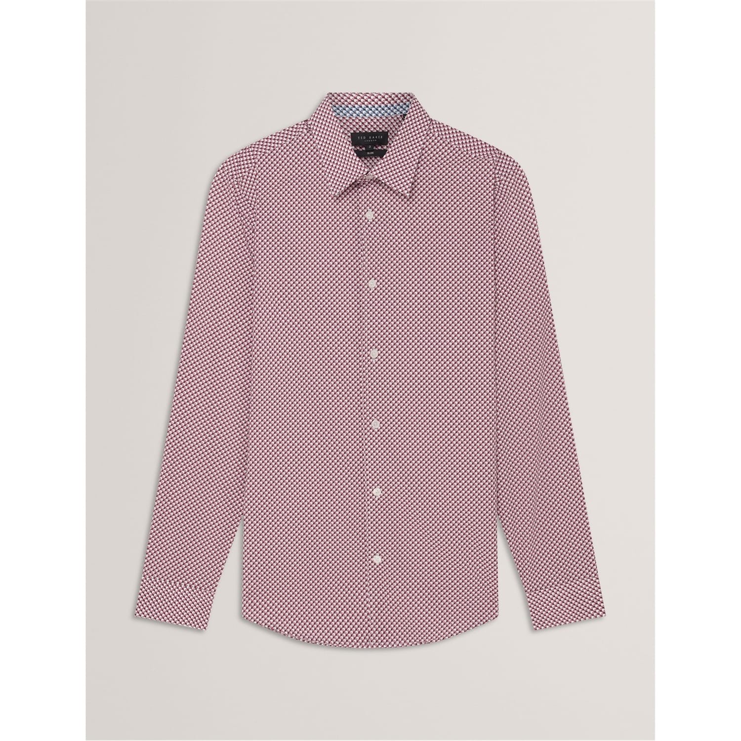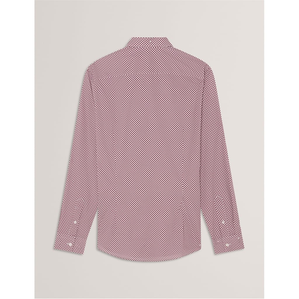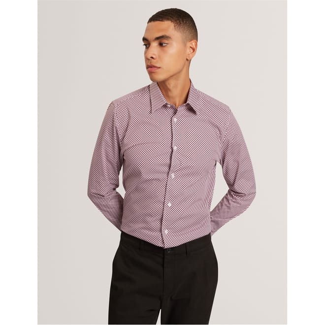 This Ted Baker top features a geometric pattern, offering a stylish and modern look. Designed with long sleeves and a shirt collar, it provides a classic touch. The regular fit ensures comfort, while the full button closure and button placket add functional elegance. Finished with barrel cuffs, this top is a versatile addition to any wardrobe. -