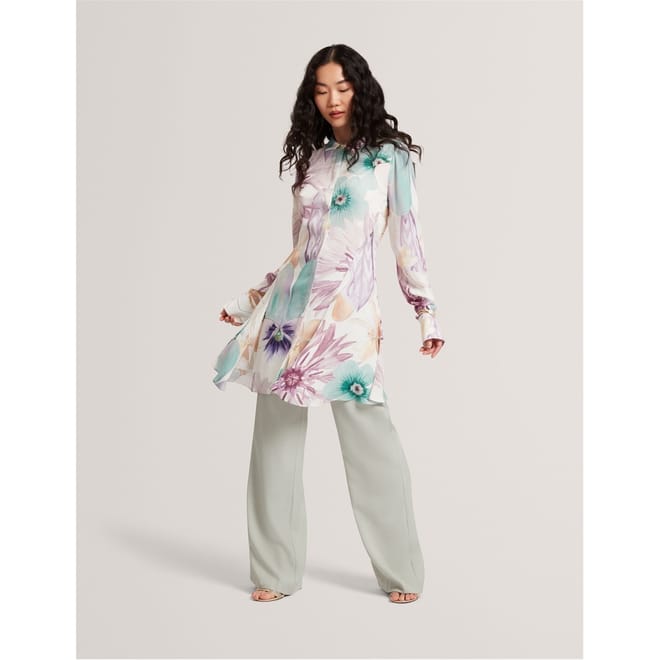 This Ted Baker mini shirt dress features a charming floral pattern, perfect for adding a touch of elegance to your wardrobe. The dress is designed with a classic shirt collar and a collared neckline, complemented by long sleeves. It offers a regular fit and a curved hem, with a button closure for a refined finish. -