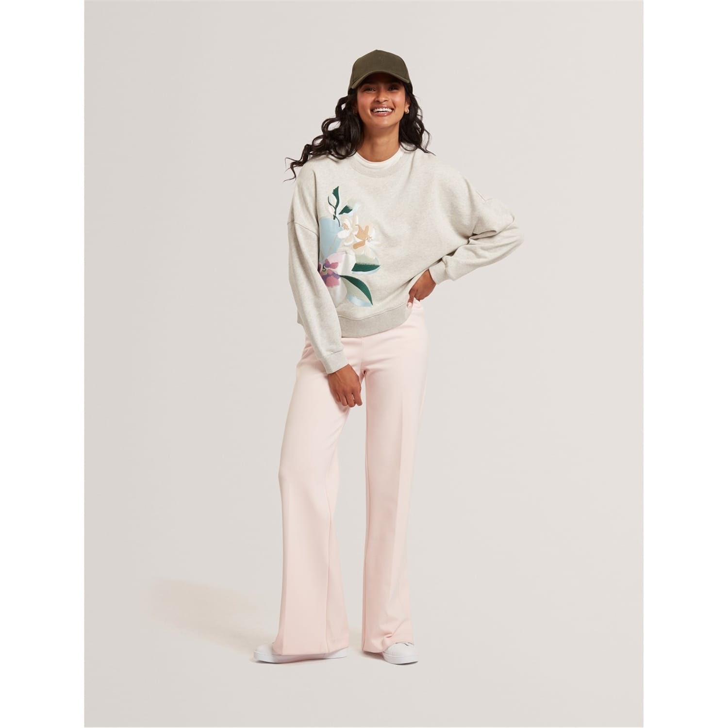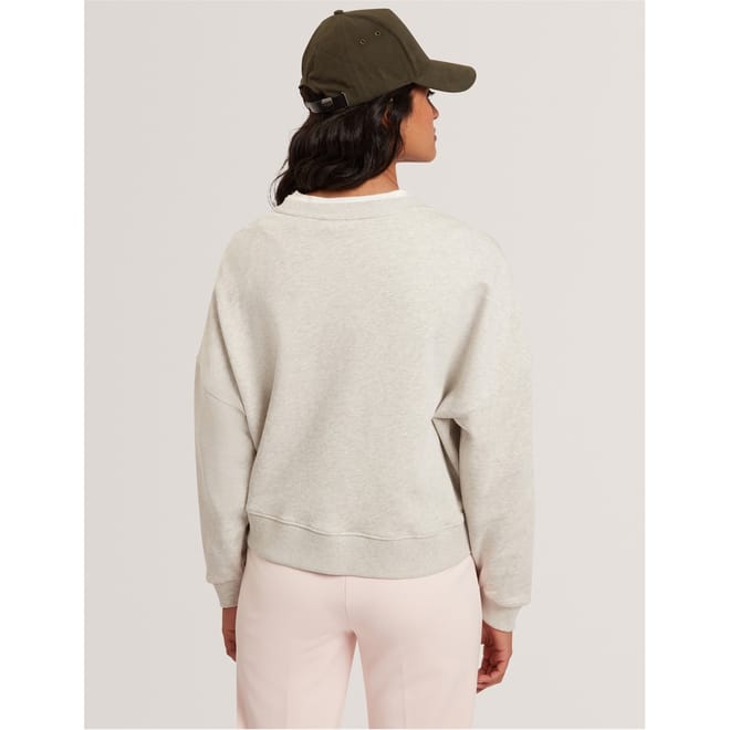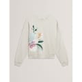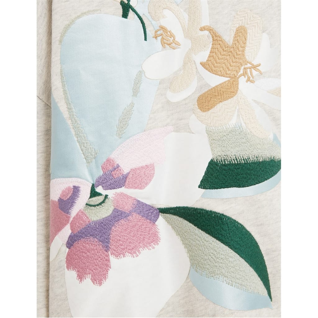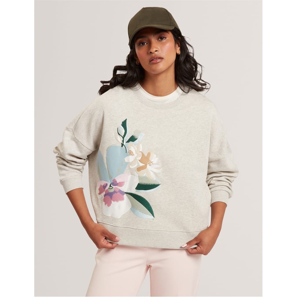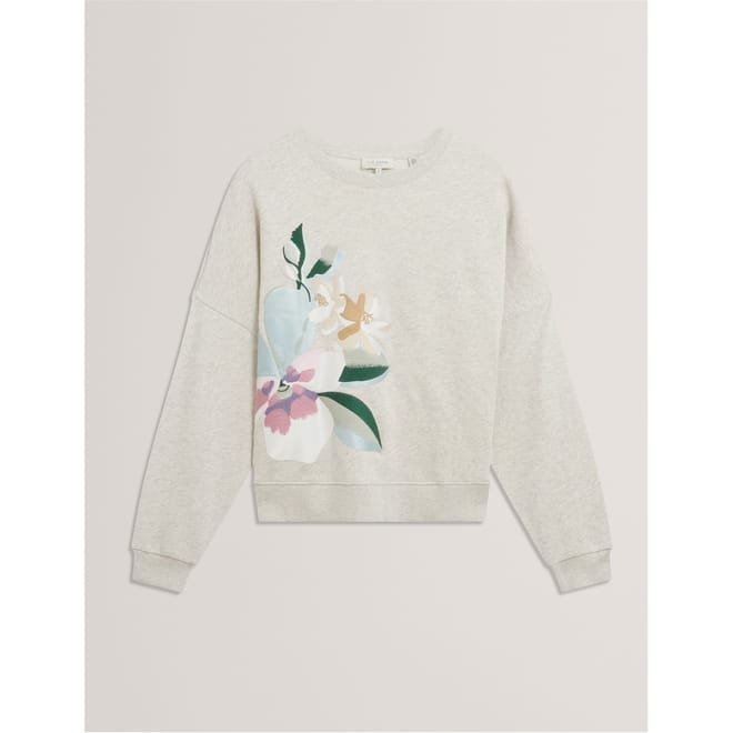 This Ted Baker top features a relaxed fit with a crew neck and long sleeves. The drop shoulder design adds a modern touch, while the ribbed cuffs ensure a comfortable fit. Adorned with a floral pattern, this top is a stylish choice for any occasion. -