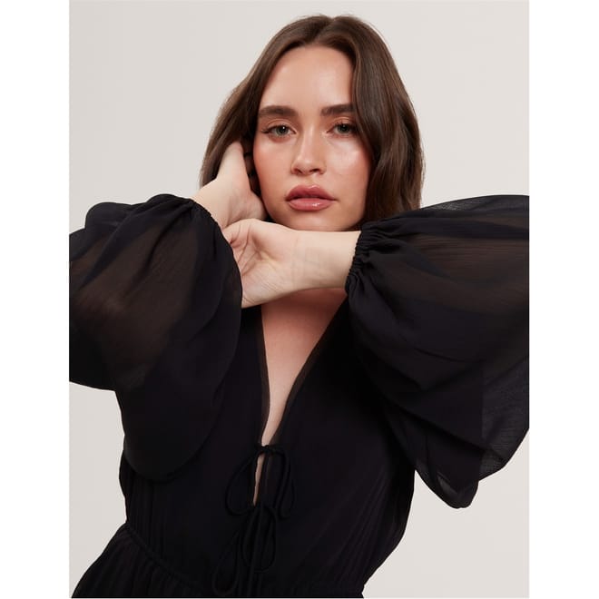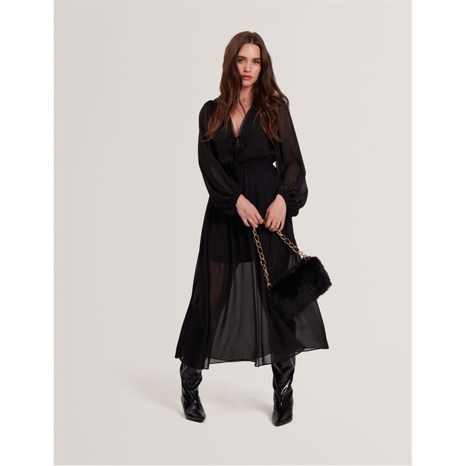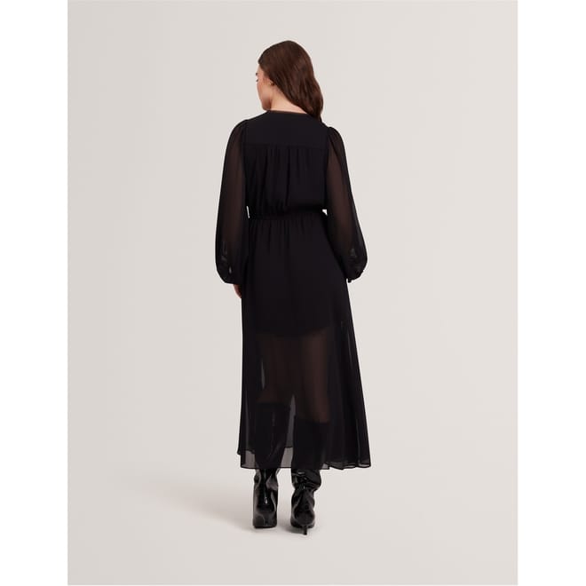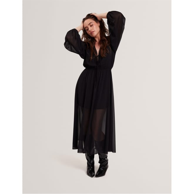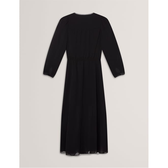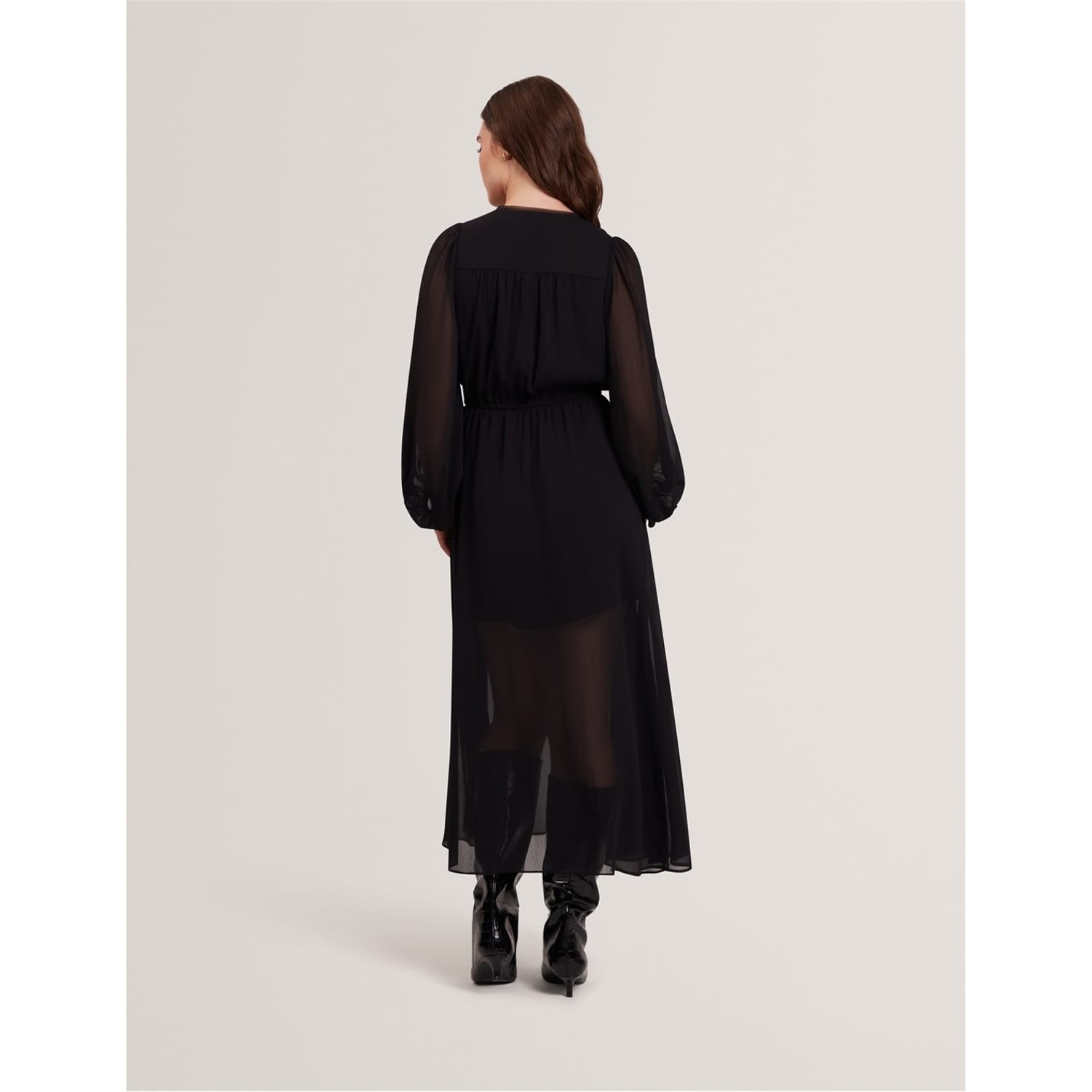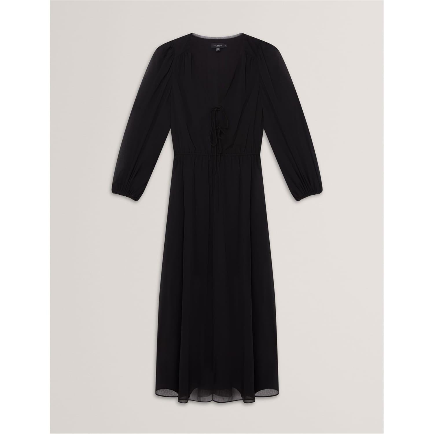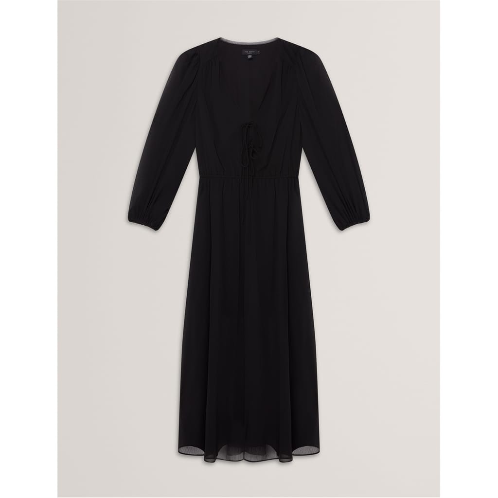 This Ted Baker midi dress is a sophisticated choice for any occasion. Featuring a V-neck and long bishop sleeves, it offers a stylish silhouette with its A-line design. The dress is crafted with a solid print and a curved hem, providing a modern touch. The tie closure adds a unique element, while the regular fit ensures comfort and elegance. -