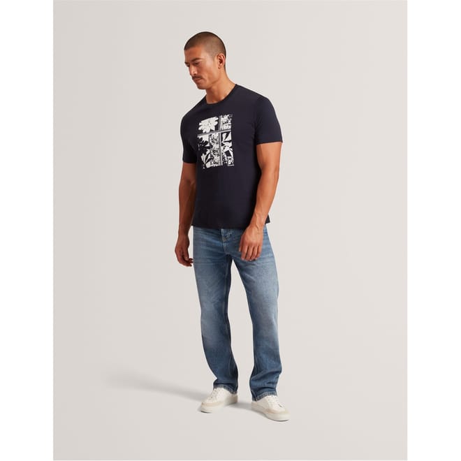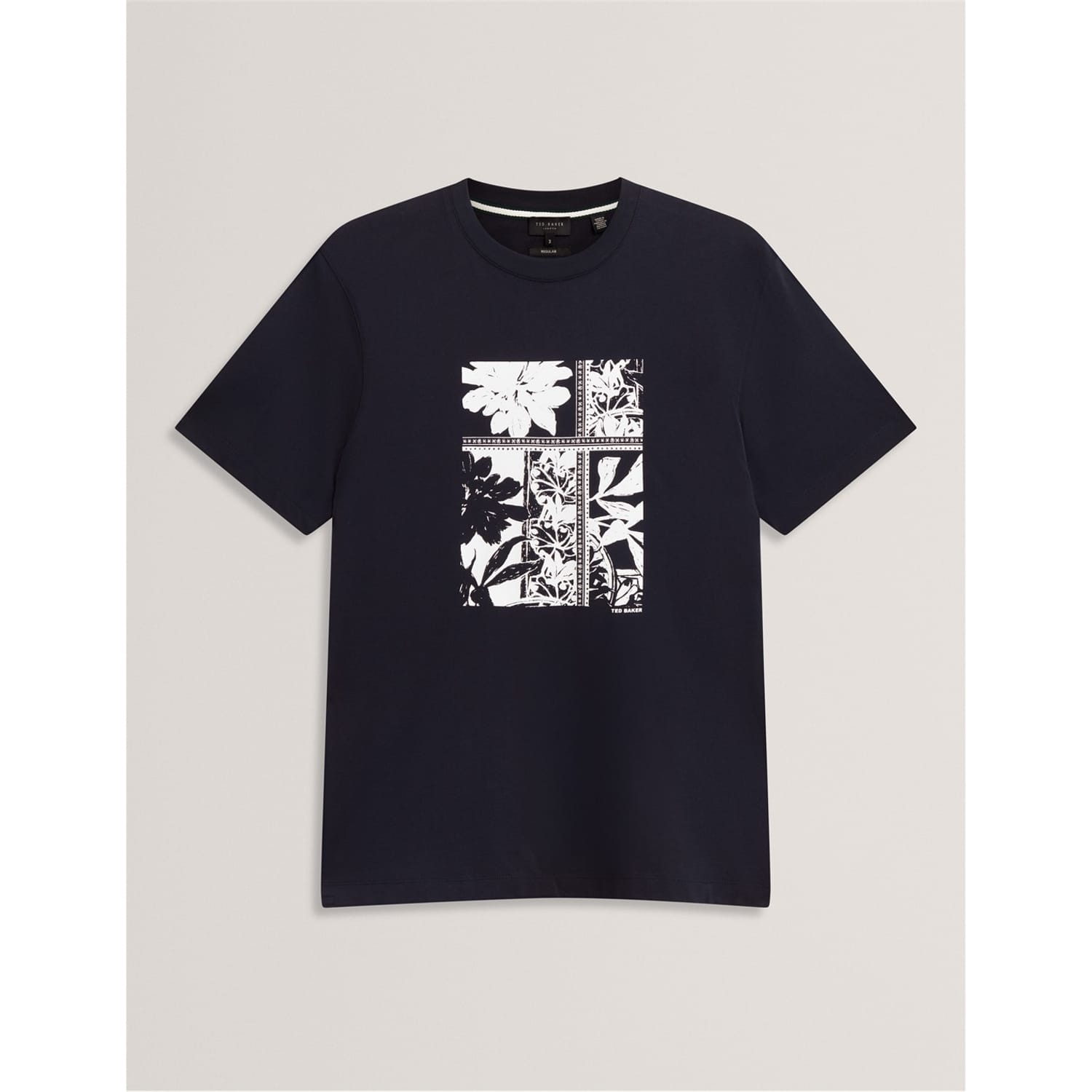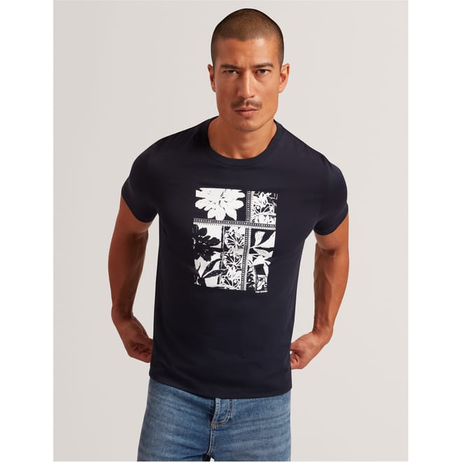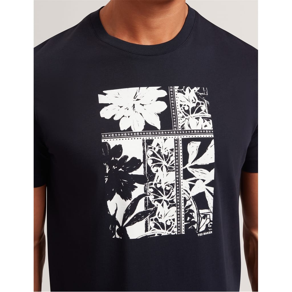 This Ted Baker top features a regular fit with a striking box print graphic. Designed for casual collections, it showcases a crew neck and short sleeves. The graphic print adds a unique touch, making it a standout piece in any wardrobe. -