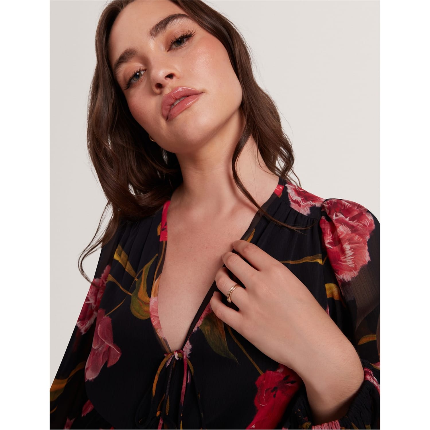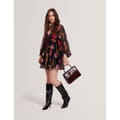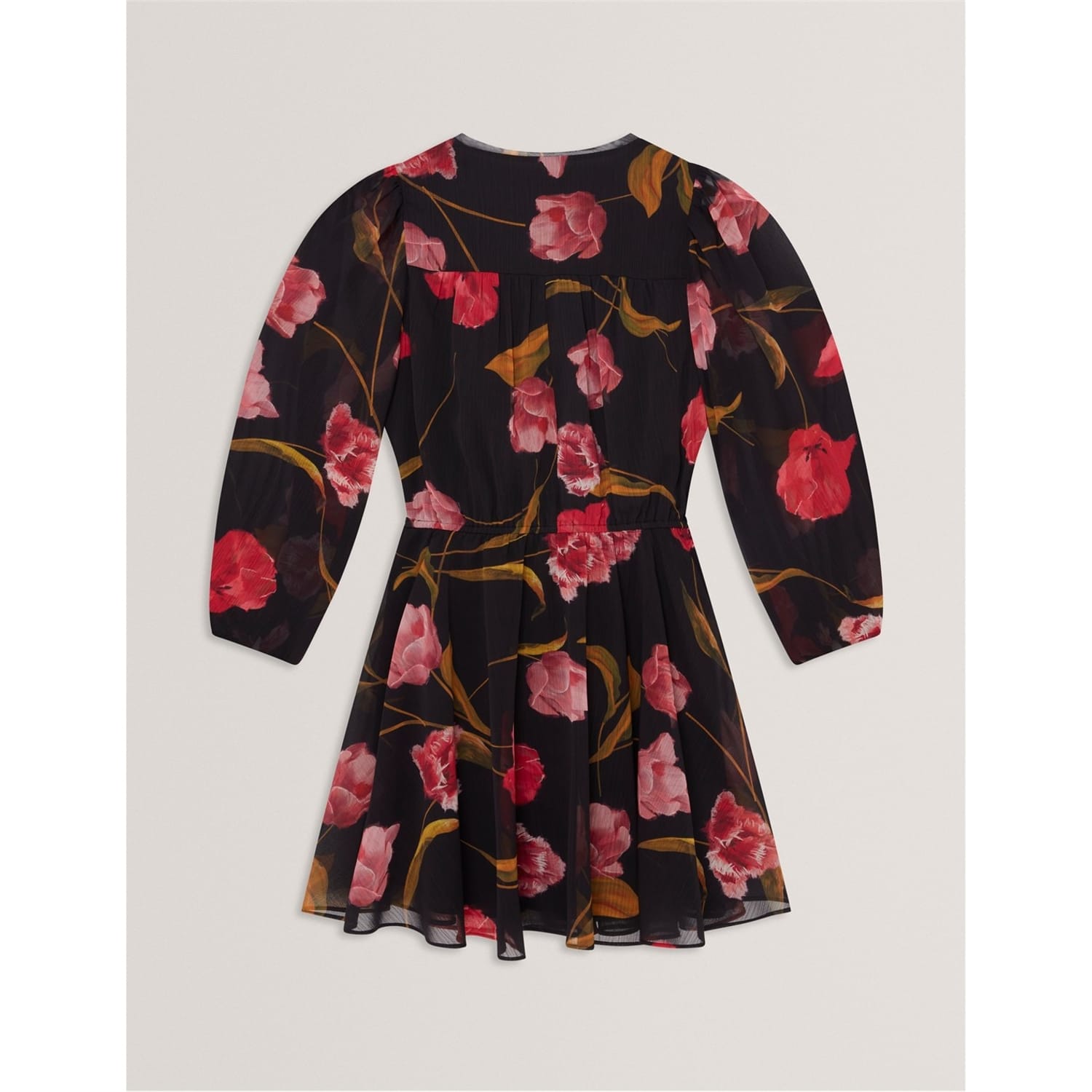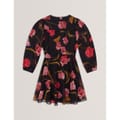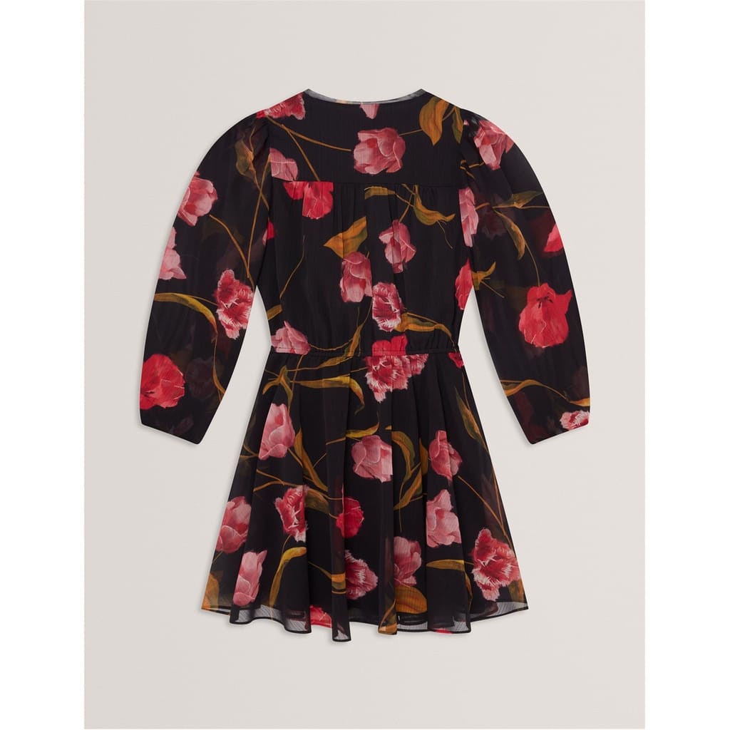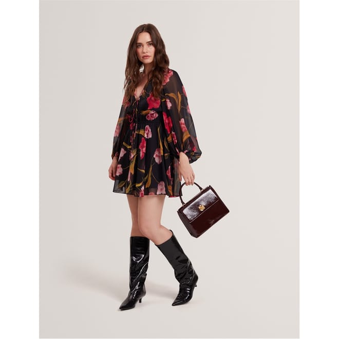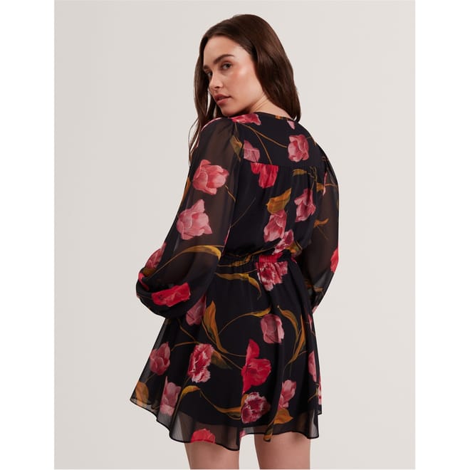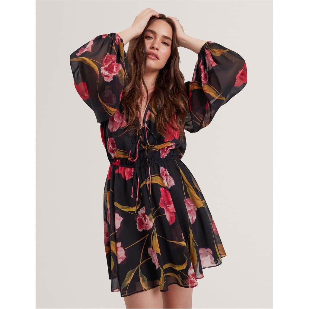 Discover the Ted Baker mini babydoll dress, a perfect blend of elegance and style. This woven piece features a solid and floral pattern, complemented by a v-neck and three-quarter balloon sleeves. The dress is designed with a curved hem and a tie closure, offering a regular fit that enhances its sophisticated appeal. -
