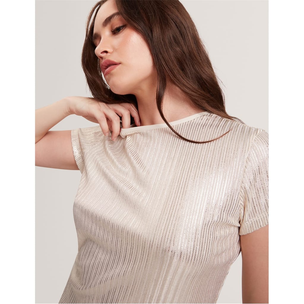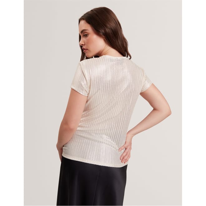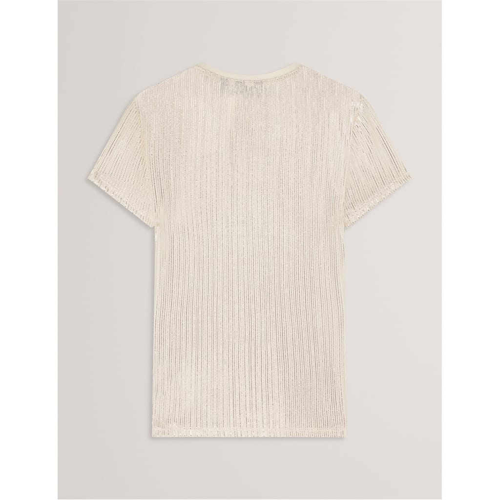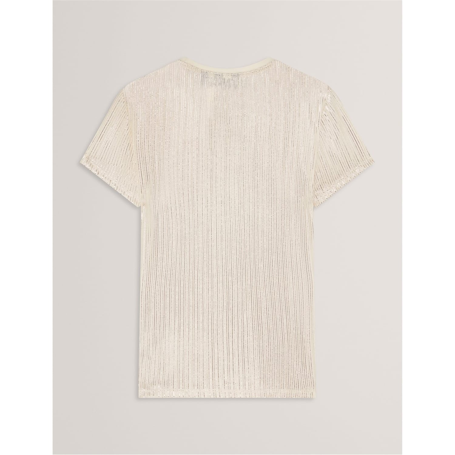 This Ted Baker top features a slim fit and a crew neck, offering a modern and stylish look. The short sleeves add a casual touch, while the metallic pattern provides a unique and eye-catching element. Perfect for those seeking a blend of comfort and contemporary design. -