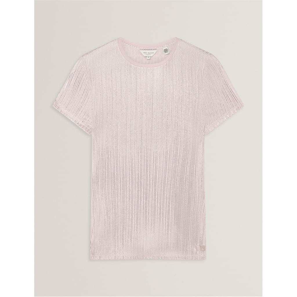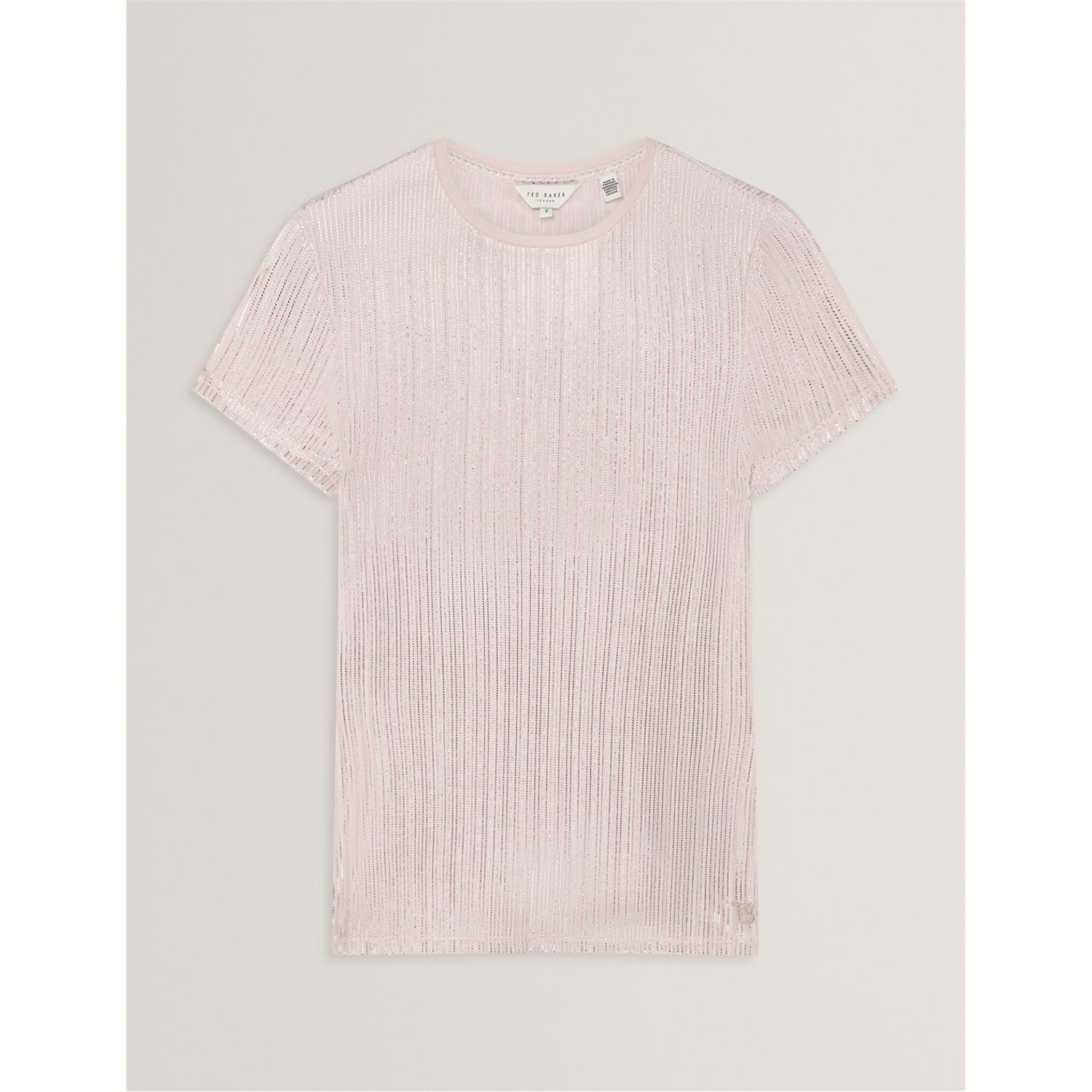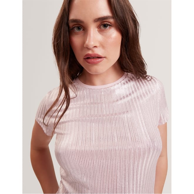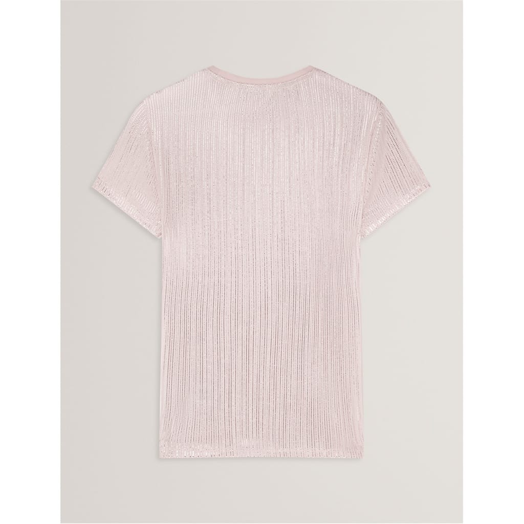 This Ted Baker top features a slim fit and a crew neck, offering a modern silhouette. The short sleeves add a casual touch, while the metallic pattern provides a stylish edge. Perfect for those seeking a blend of comfort and contemporary design. -