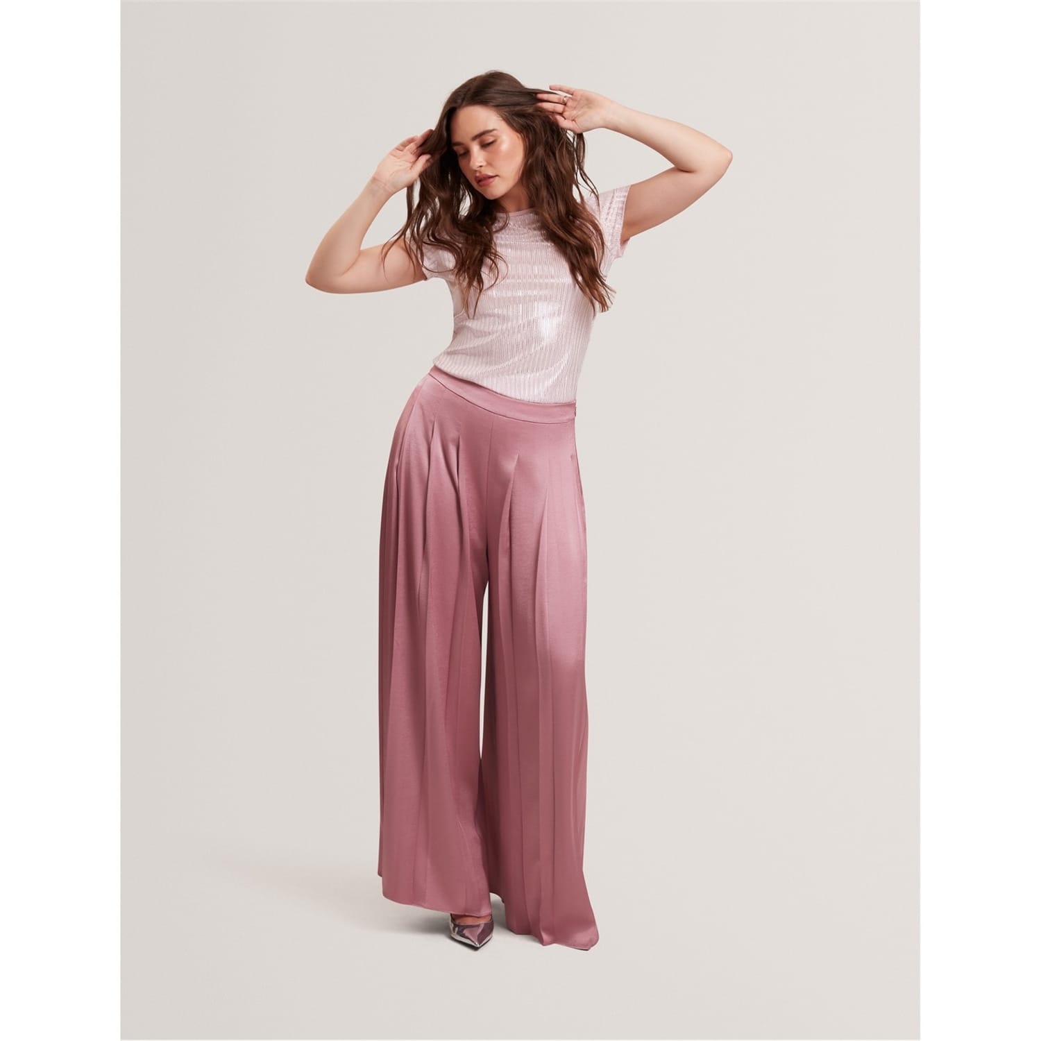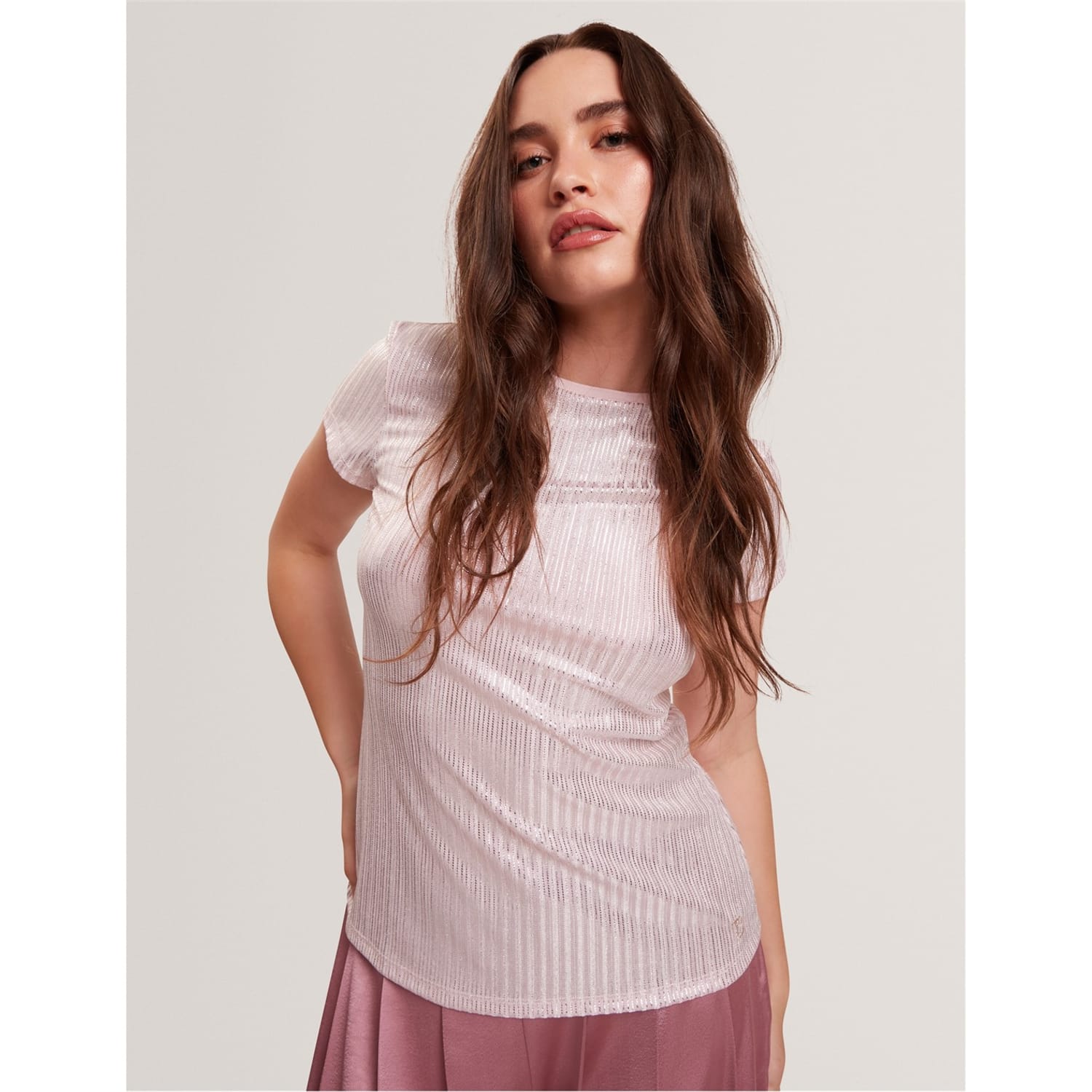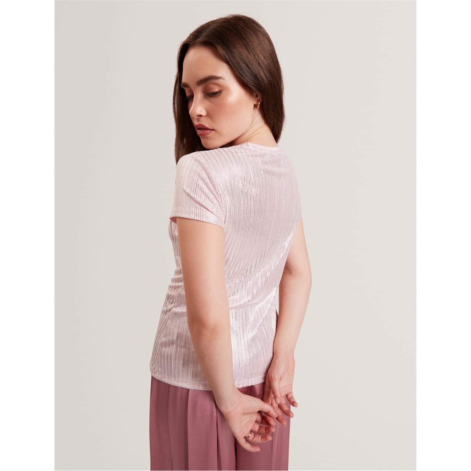 This Ted Baker top features a slim fit and a crew neck, offering a modern silhouette. The short sleeves add a casual touch, while the metallic pattern provides a stylish edge. Perfect for those seeking a blend of comfort and contemporary design. -