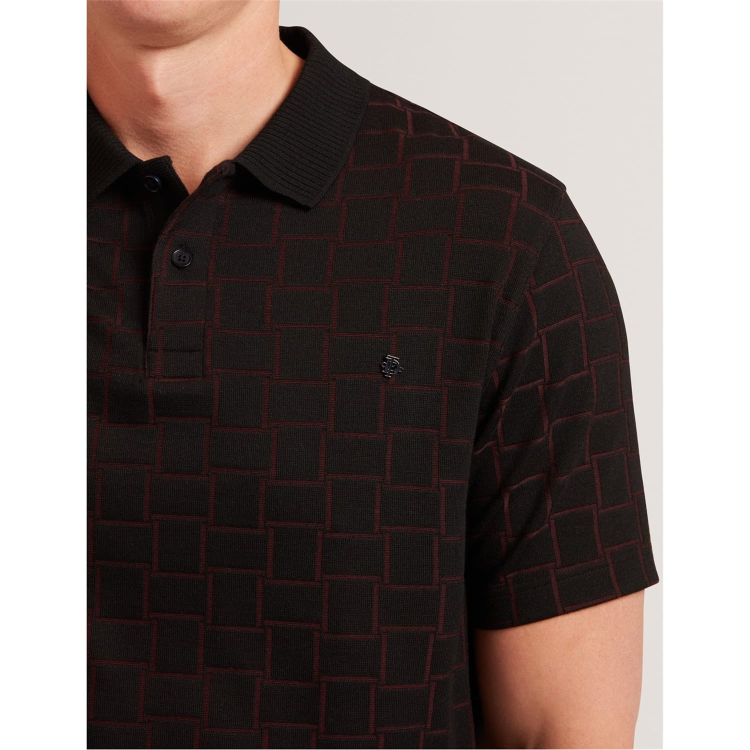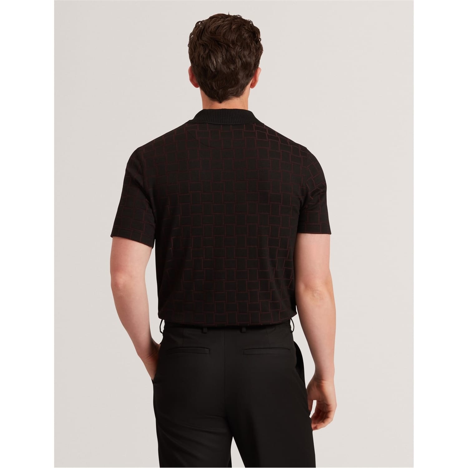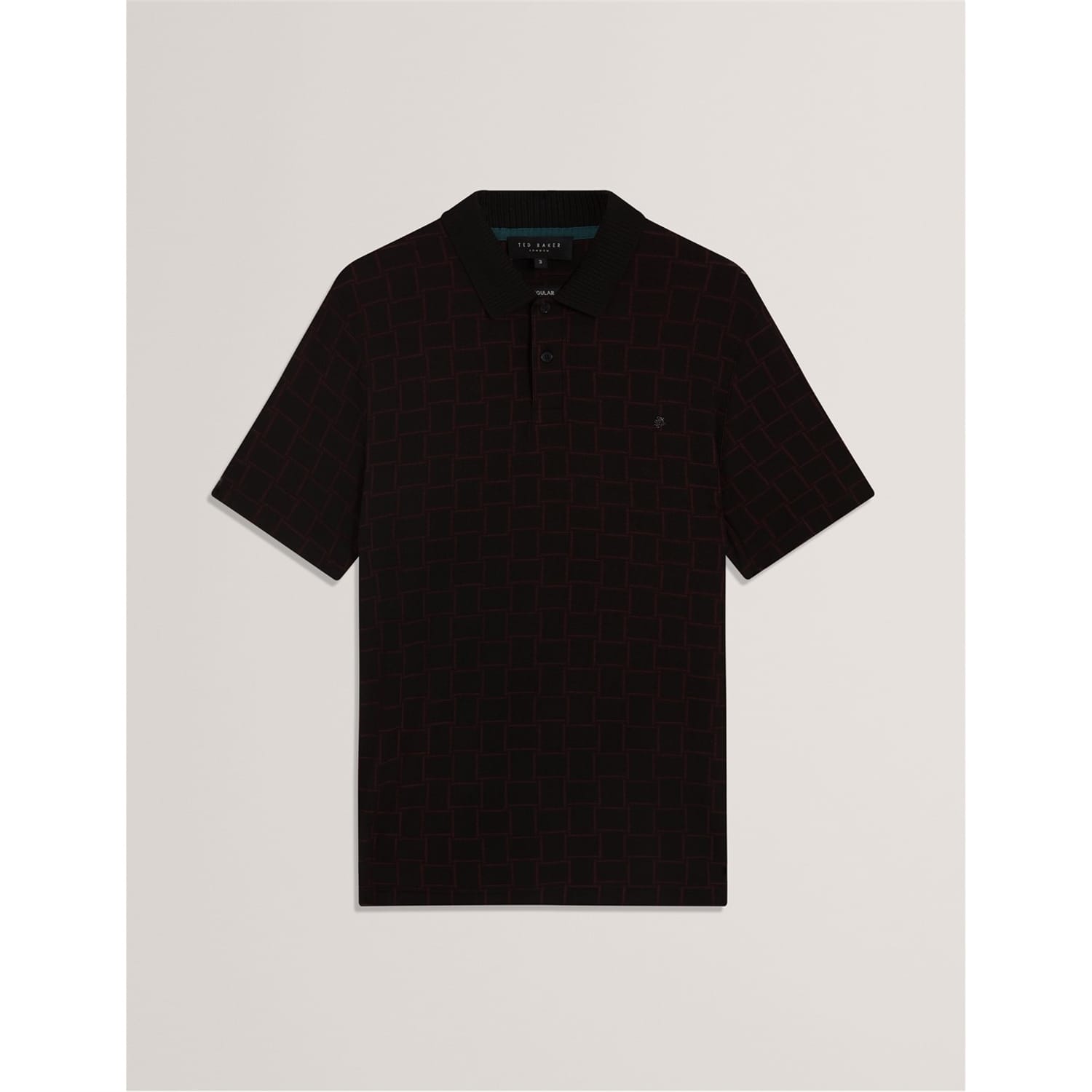 This Ted Baker top features a classic polo collar and a stylish checkerboard pattern. Designed with short sleeves and a button closure, it offers a regular fit for comfortable wear. Perfect for adding a touch of sophistication to your wardrobe. -