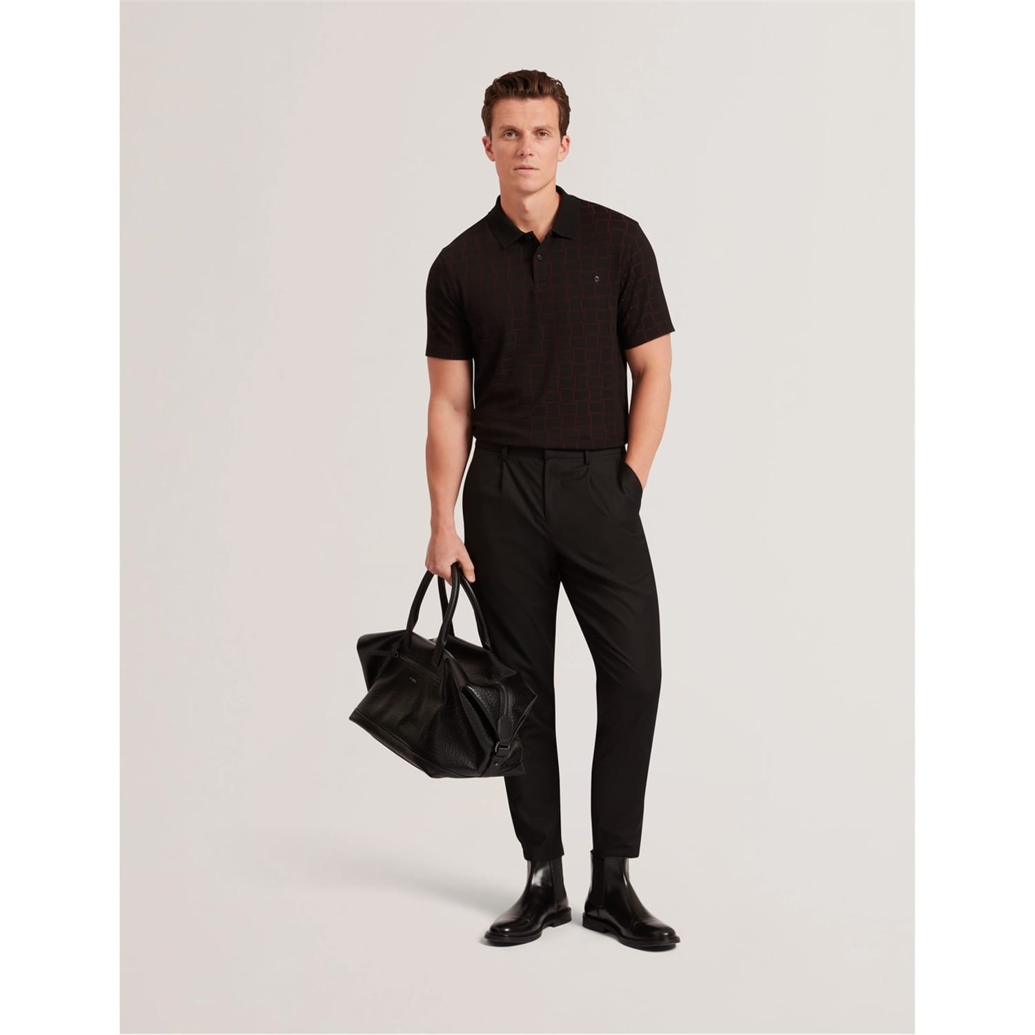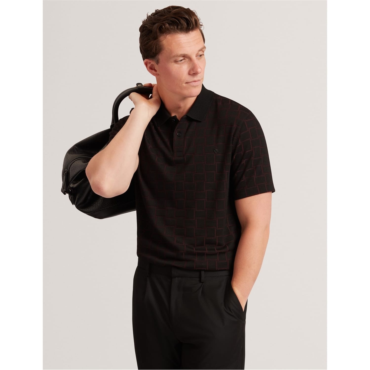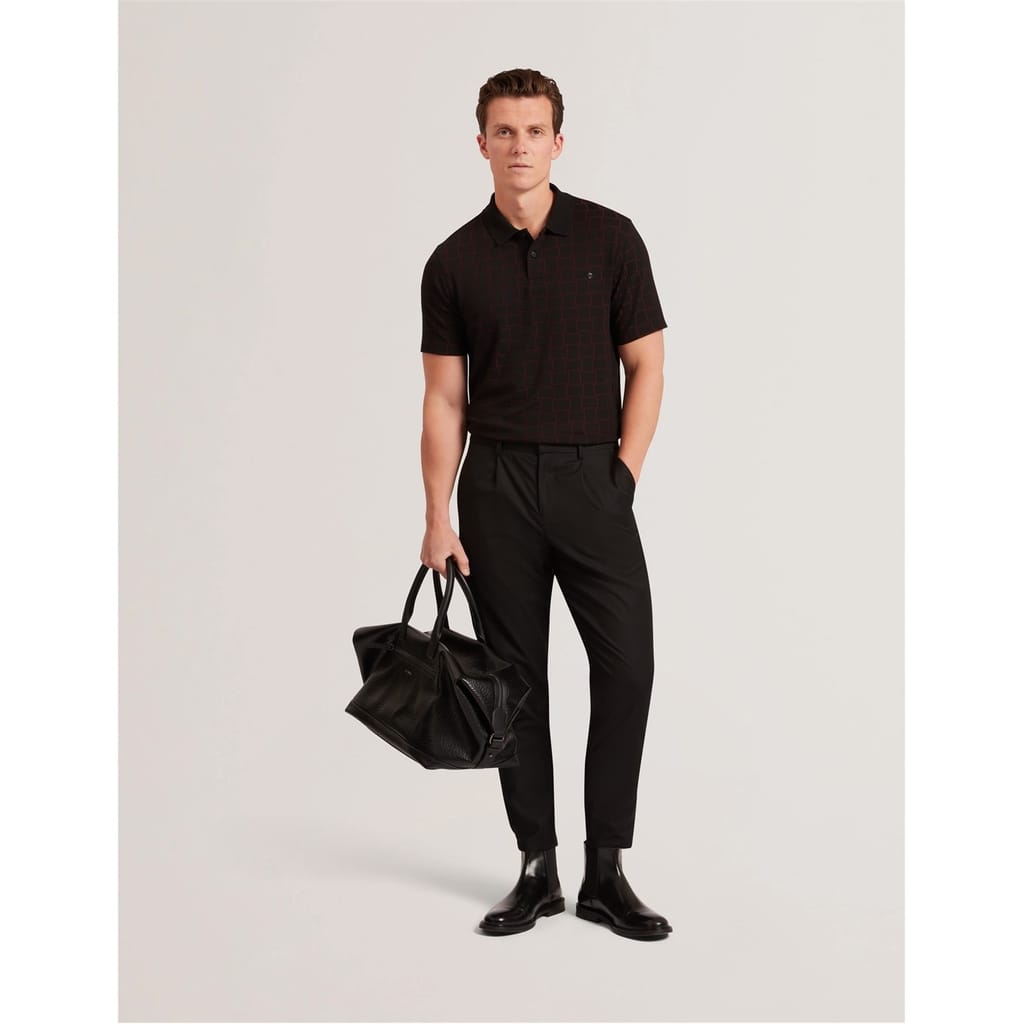 This Ted Baker top features a classic polo collar and a stylish checkerboard pattern. Designed with short sleeves and a button closure, it offers a regular fit for comfortable wear. Perfect for adding a touch of sophistication to your wardrobe. -