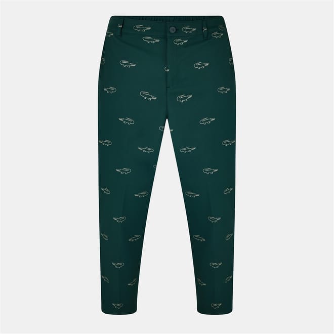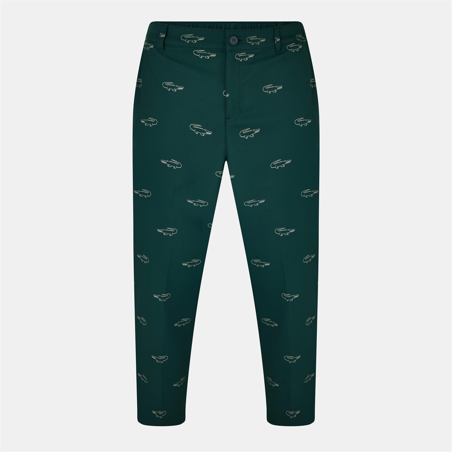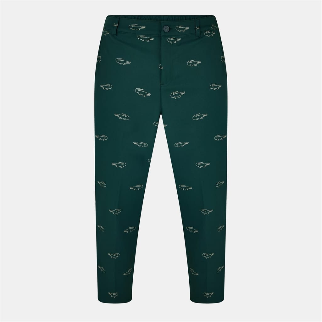 Lacoste trousers feature a regular fit with a button and zip fly closure. These pants are adorned with an all-over logo pattern, adding a distinctive touch. Part of the sporting activity collection, they showcase the iconic Lacoste logo, making them a stylish choice for any casual occasion. -