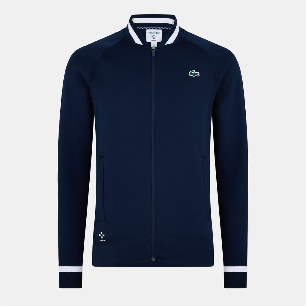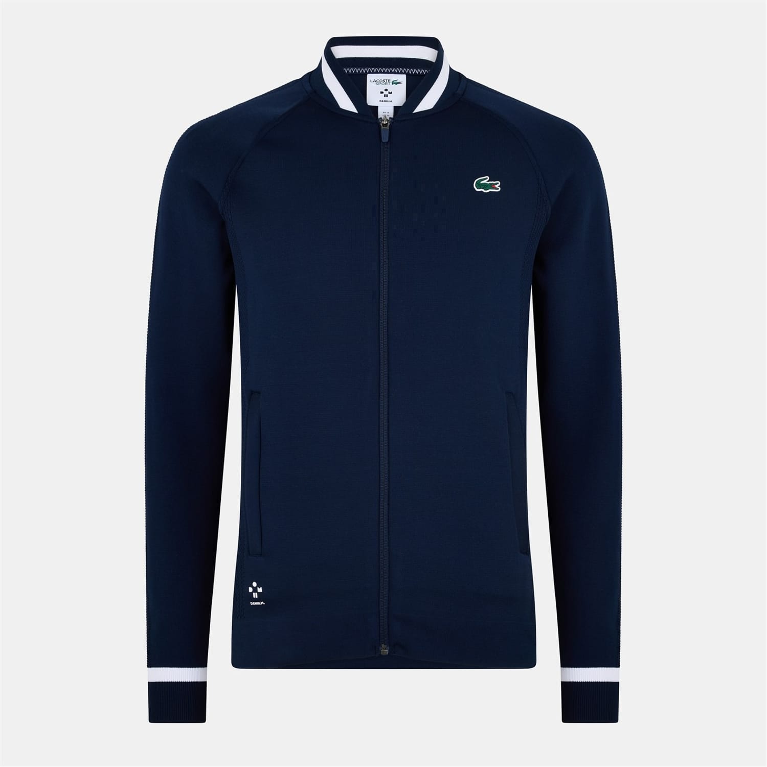 This Lacoste track jacket from the activewear collection is designed for performance. It features a ribbed crew neck, ribbed collar, and ribbed hem, offering a regular fit. The solid pattern is complemented by a zipper closure and a distinctive chest logo. Ideal for those seeking a blend of style and functionality. -