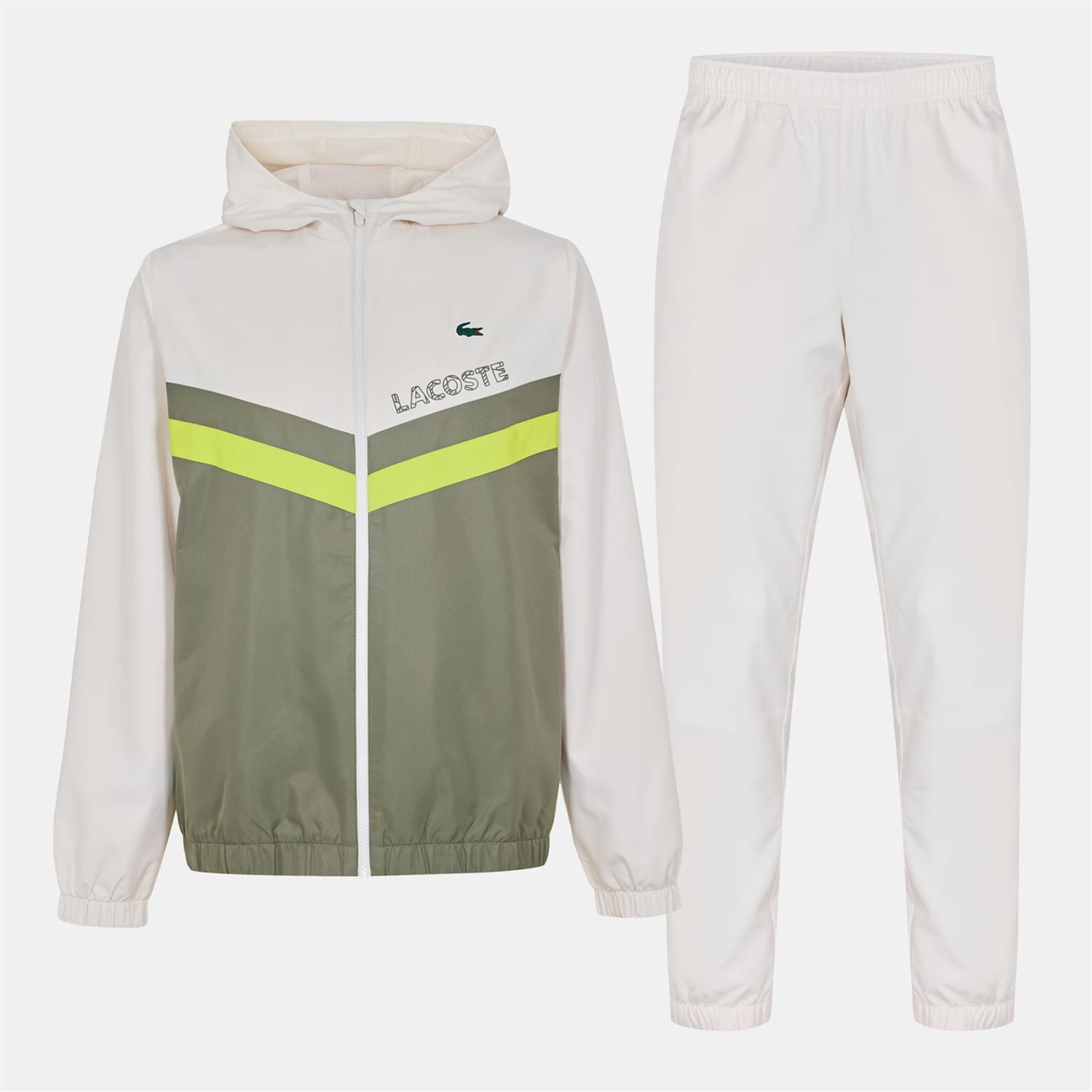 Elevate your activewear collection with this Lacoste full track suit. Featuring a colour block design, the set includes a hooded neck sweatshirt with long plain sleeves and a logo embellishment. The athletic track pants complete the ensemble, offering both style and performance. Ideal for those seeking a blend of comfort and functionality. -