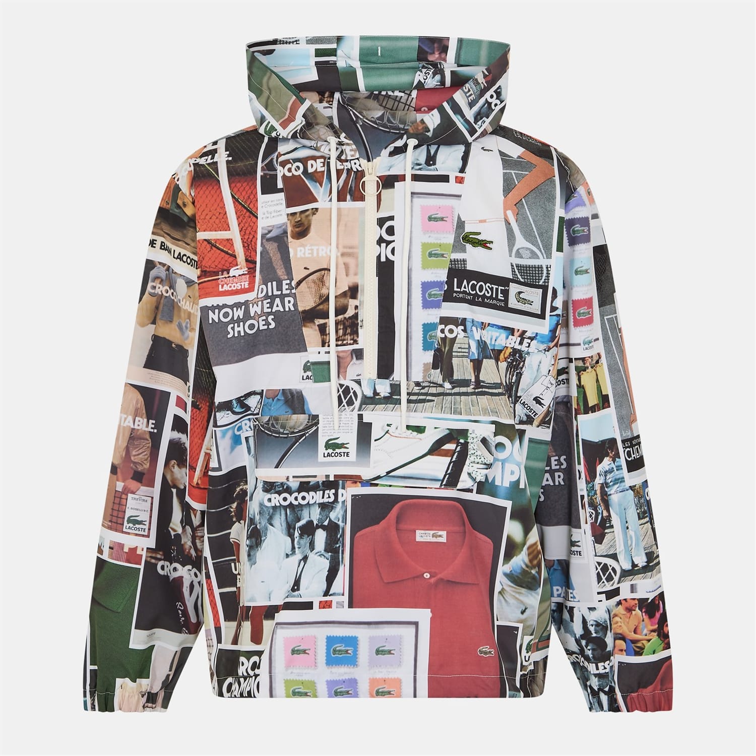 This Lacoste hooded jacket from the Classics collection is designed with a water-repellent finish, perfect for unpredictable weather. It features a relaxed fit with a straight hem and elasticated cuffs for comfort. The jacket is adorned with Lacoste lettering and a logo, adding a touch of style. The drawstring and zipper closure ensure a secure fit, while the graphic print enhances its modern appeal. -