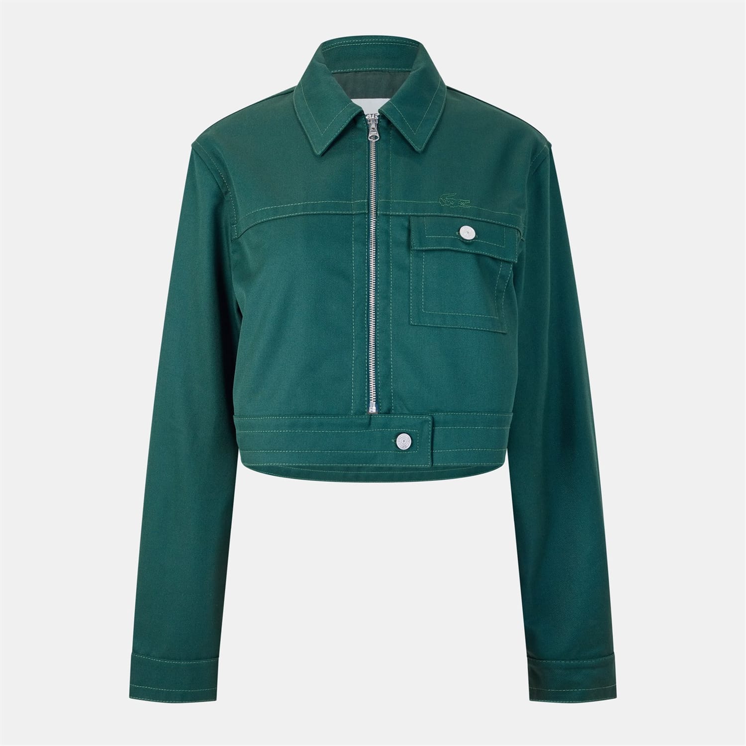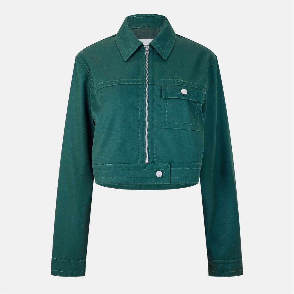 This Lacoste denim jacket features a classic shirt collar and a straight hem. Designed in a regular fit, it offers a solid pattern with a short length. The jacket is equipped with a zipper closure and includes practical embellishments such as a logo, pocket, and chest pocket for added functionality. -