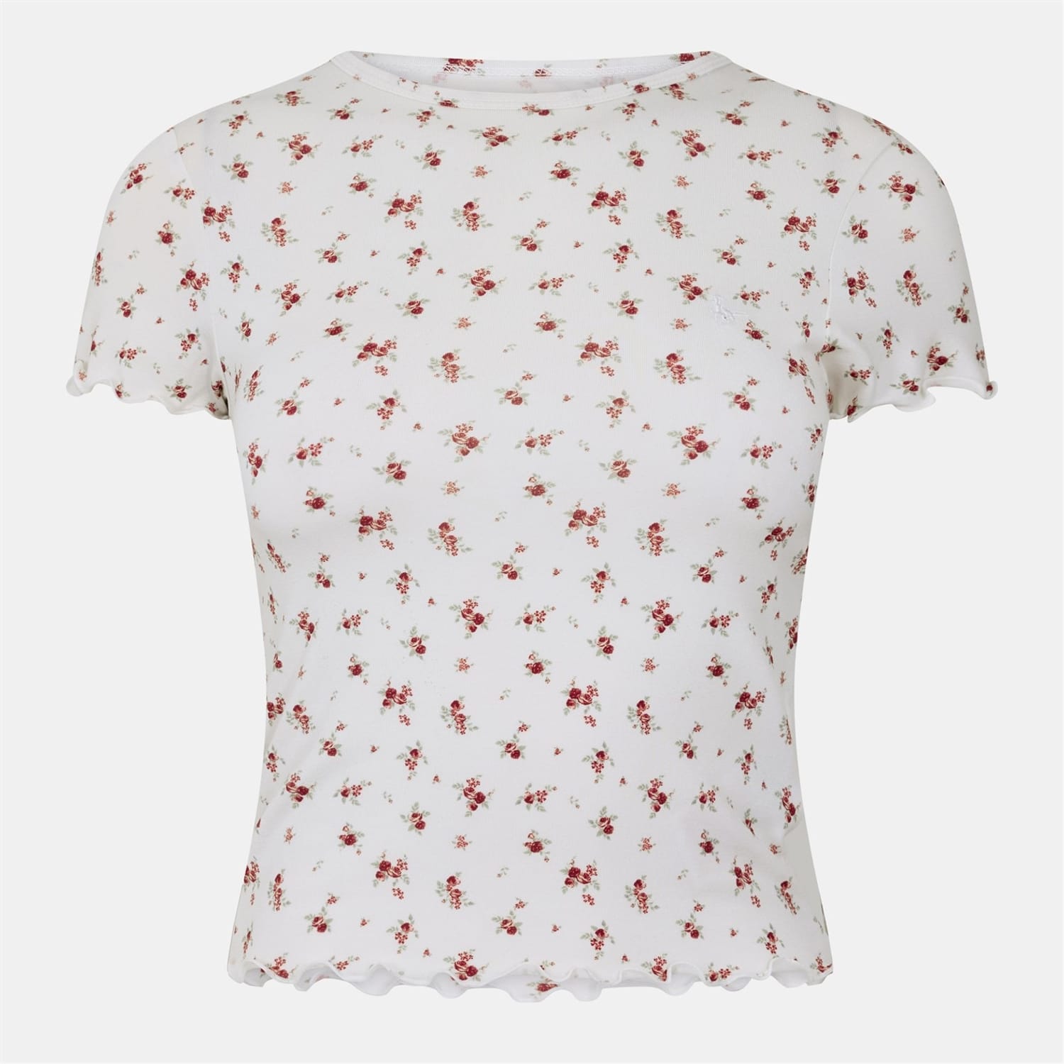 This Jack Wills top features a floral print, offering a stylish addition to your wardrobe. Designed with a crew neck and short sleeves, it provides a comfortable fit. The slim fit enhances your silhouette, while the rounded cuffs add a subtle touch of detail. Perfect for those who appreciate a blend of fashion and comfort. -