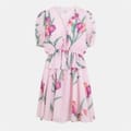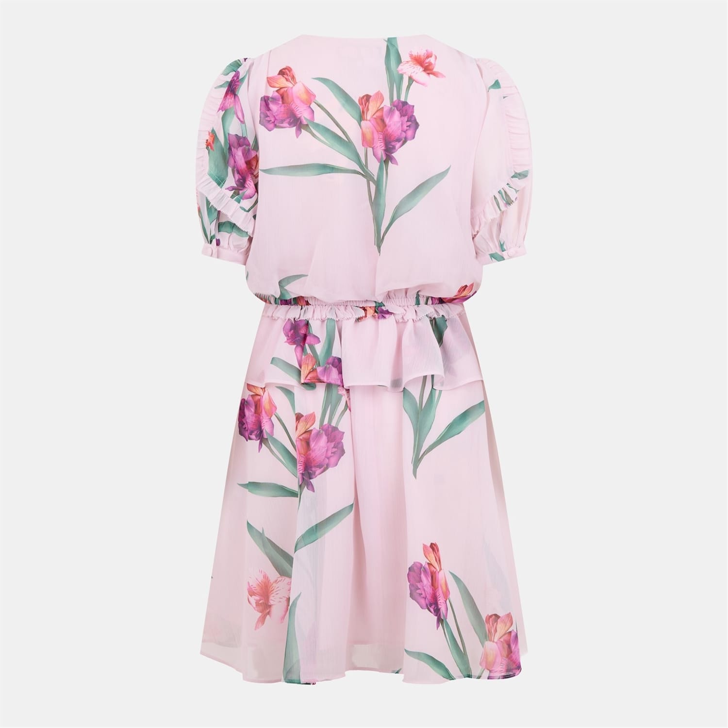 This Ted Baker mini dress features a charming floral pattern, perfect for any occasion. The A-line silhouette is complemented by a v-neck and short puff sleeves, adding a touch of elegance. Crafted from woven fabric, it includes ruffle embellishments for a playful finish. -