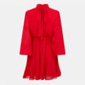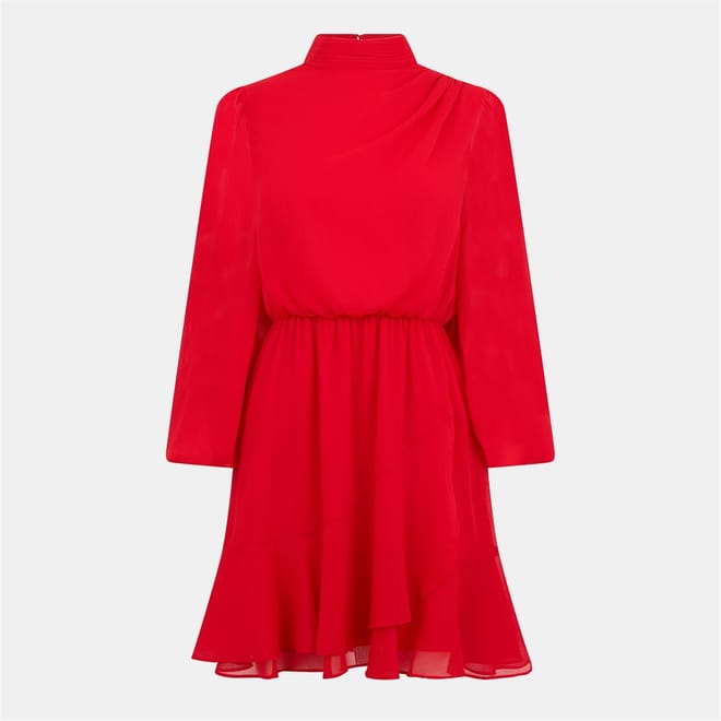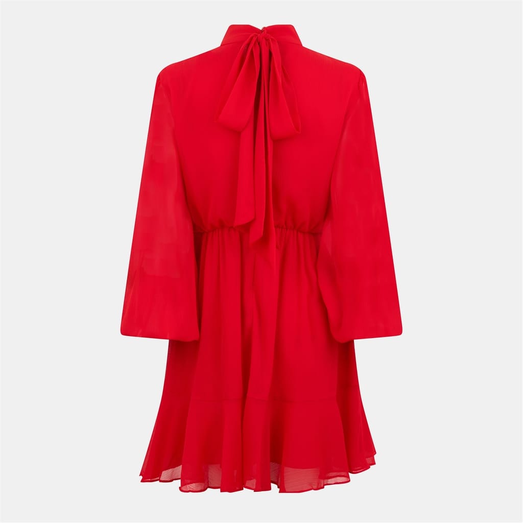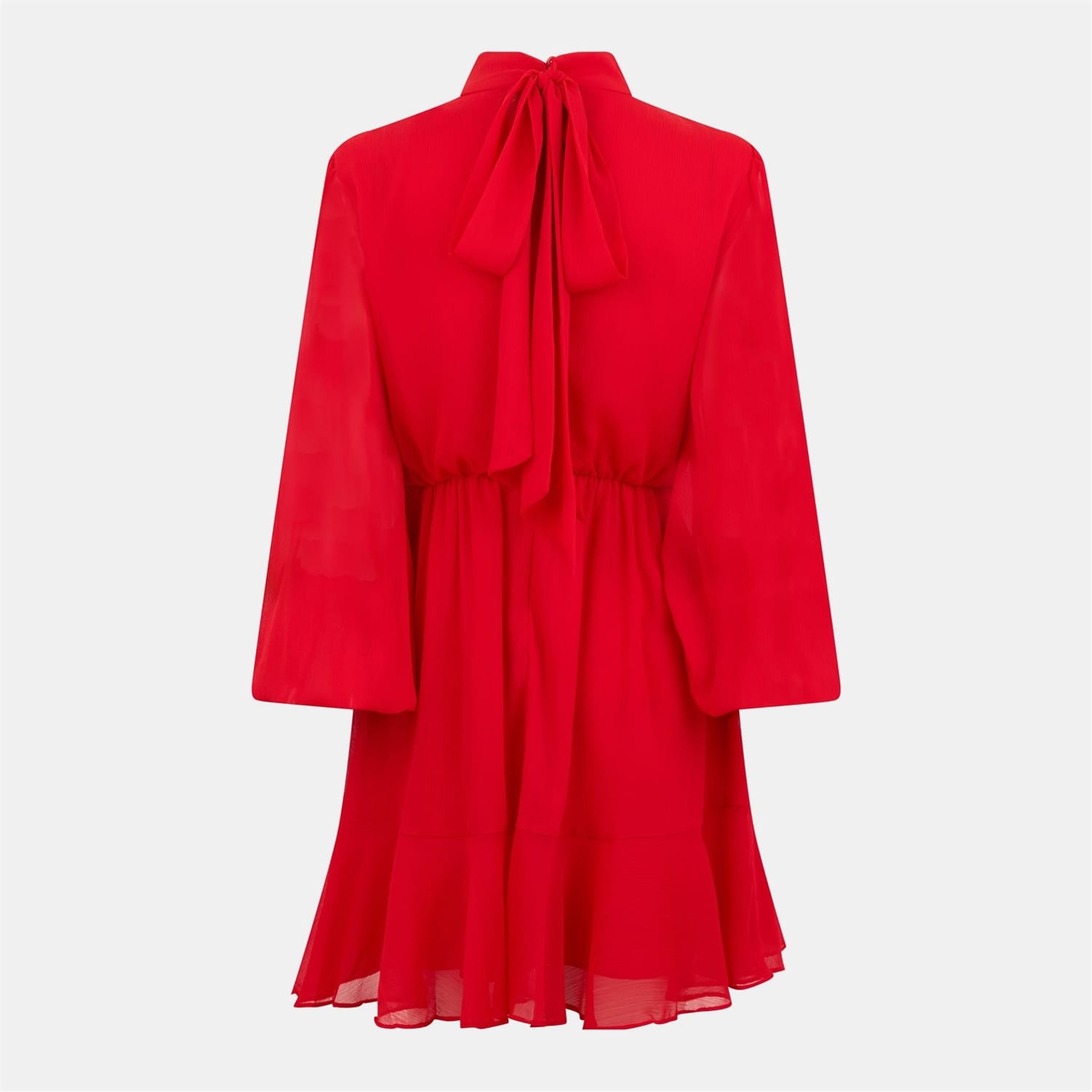 This Ted Baker mini dress features a woven design with a solid pattern. The A-line style is complemented by a tie neck and long sleeves. A ruffle hem adds a touch of elegance, making it a versatile choice for various occasions. -