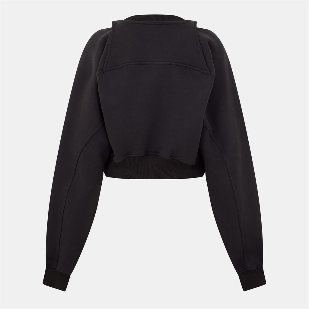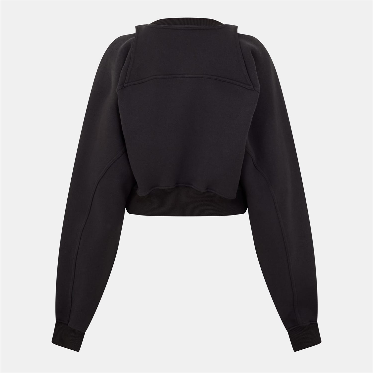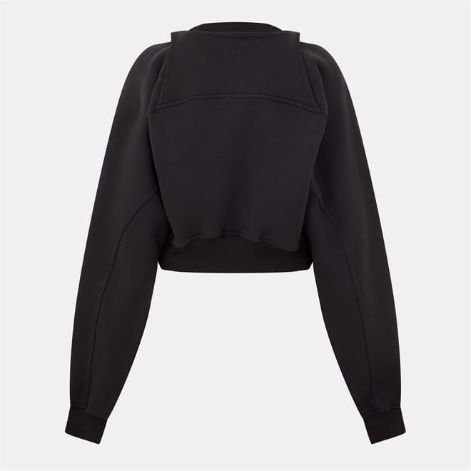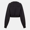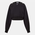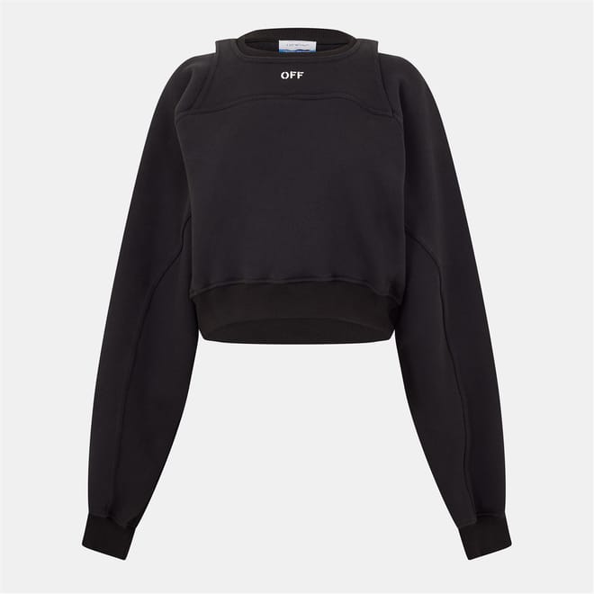 This Off White top features a crew neck and long sleeves, offering a relaxed fit. The cropped length adds a modern touch, while the ribbed collar and cuffs provide subtle detailing. The solid pattern is complemented by a logo embellishment, making it a stylish choice for any wardrobe. -