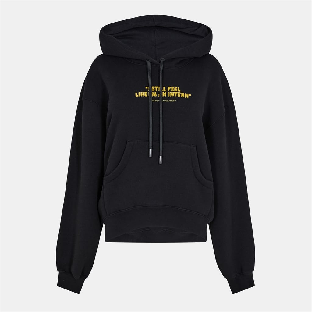 This Off White top features a hooded neck and a relaxed fit, perfect for all seasons. The long sleeves are complemented by ribbed cuffs, while the knit fabric adds a touch of comfort. Embellished with a logo and kangaroo pocket, the top showcases a graphic print with lettering. A drawstring closure completes the casual look. -