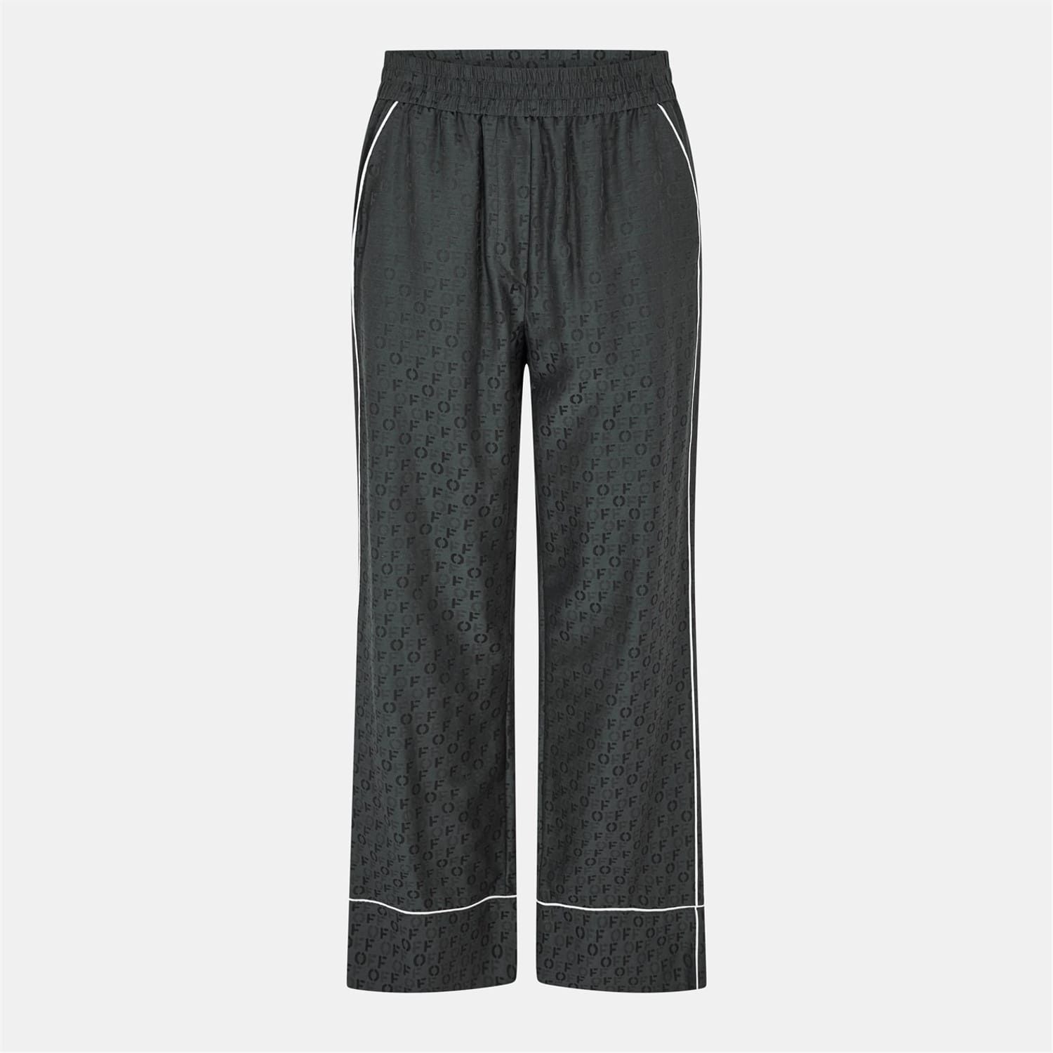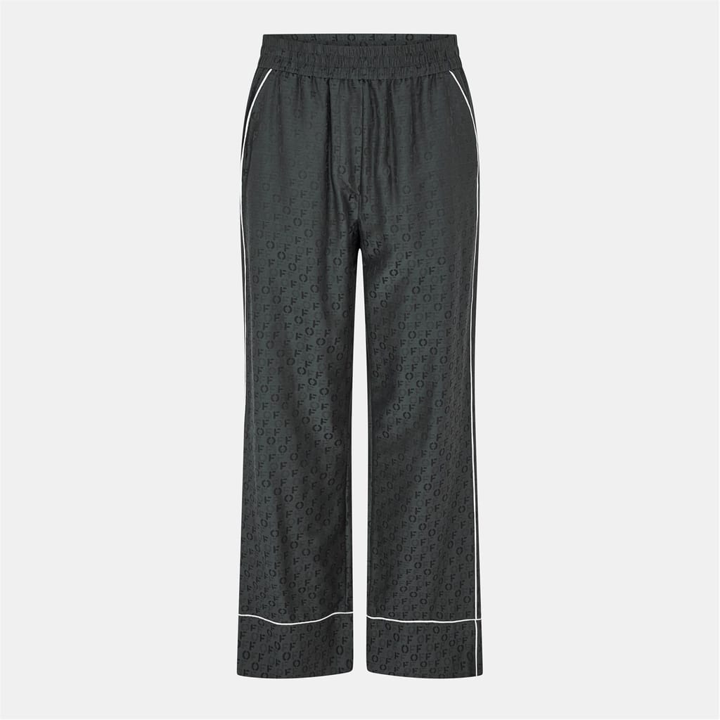 Off White presents wide-leg pajama pants, perfect for loungewear. These knit pants feature an elasticated waistband for comfort and an all-over logo pattern, adding a distinctive touch. The logo embellishment enhances the casual style, making them a standout choice for relaxed settings. -