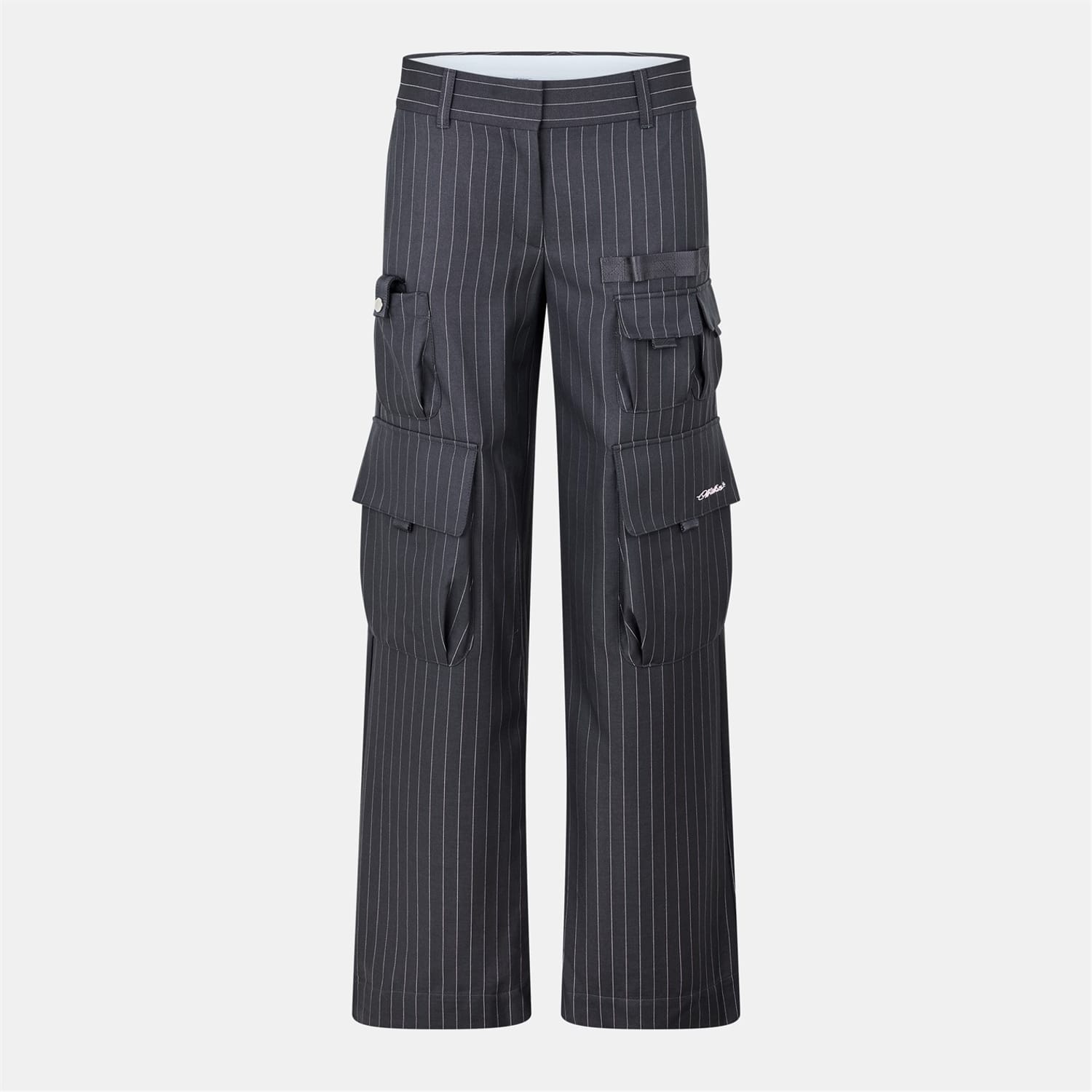 Off White cargo pants feature a stylish stripe pattern and a wide-leg cut. Designed with a zip fly and button closure, these pants offer both functionality and fashion. The addition of pockets enhances practicality, making them a versatile choice for casual collections. -