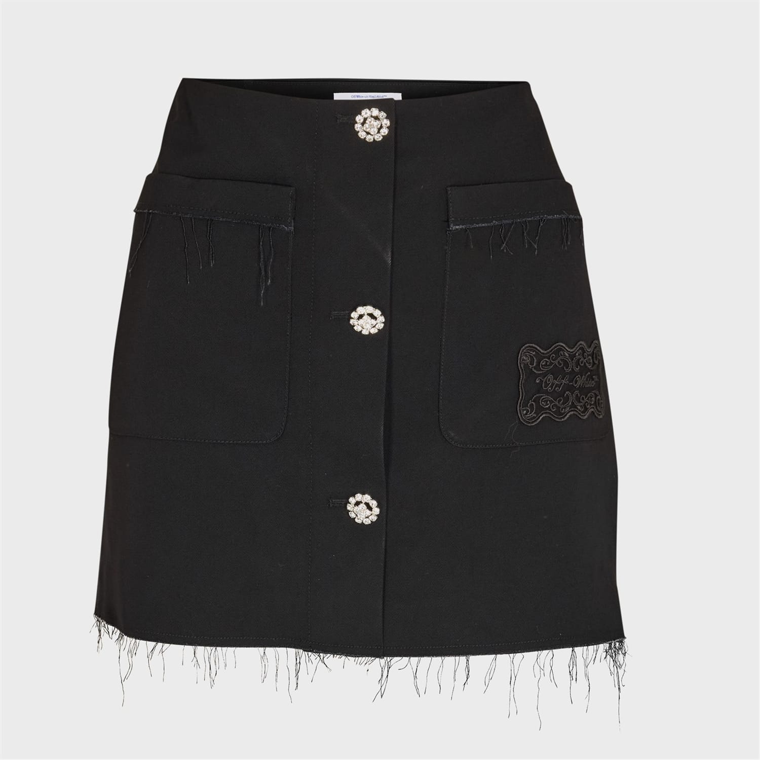 This Off-White mini A-line skirt is a standout piece from the casual collection. Featuring a raw cut design, it is adorned with rhinestones and fringe detailing, adding a touch of flair. The skirt includes a button closure and a regular fit, complete with practical pockets for added convenience. -