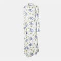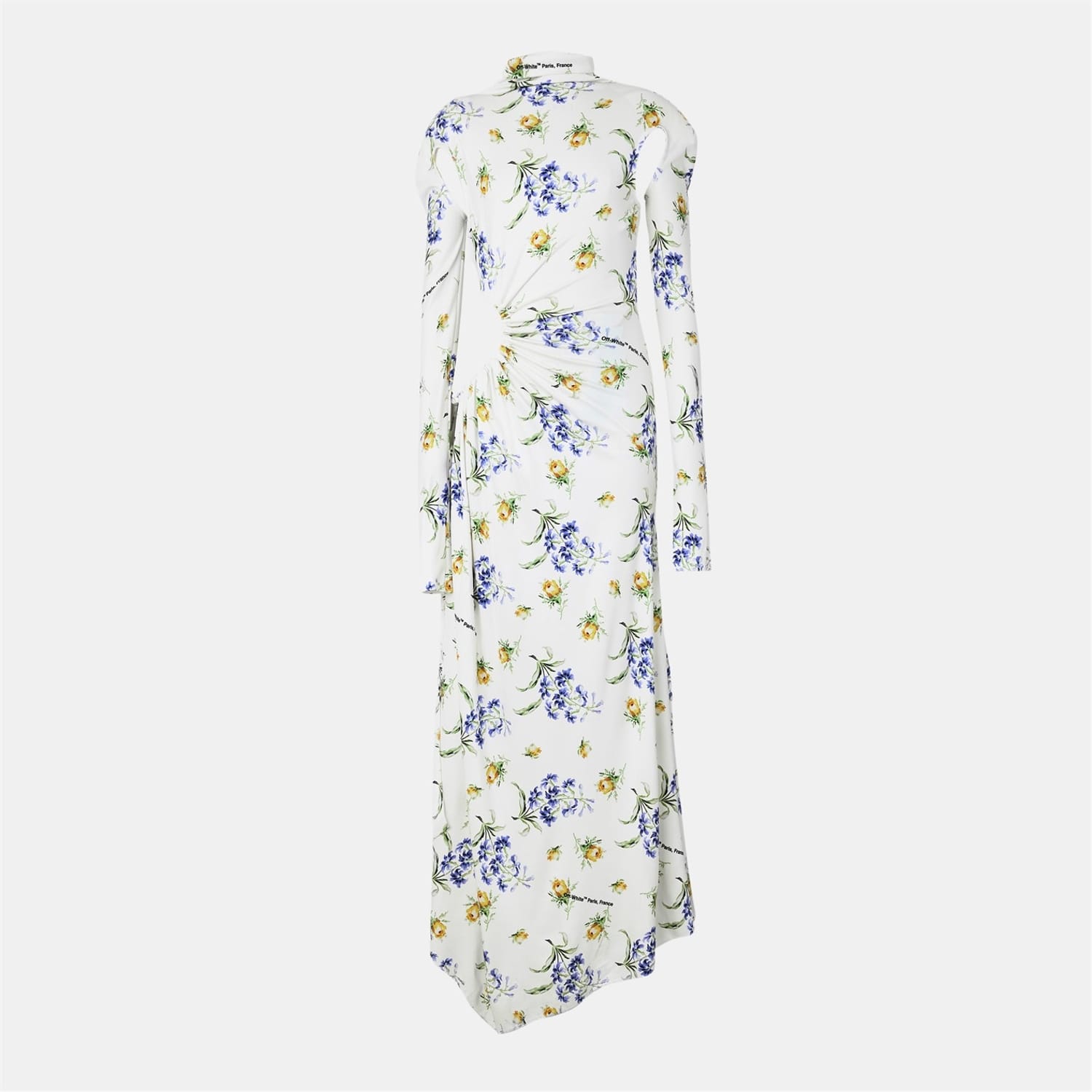 Off White maxi dress features a high neck and an asymmetrical hem, offering a unique floral pattern. The slim fit enhances the silhouette, making it a standout piece for any occasion. -
