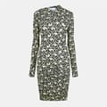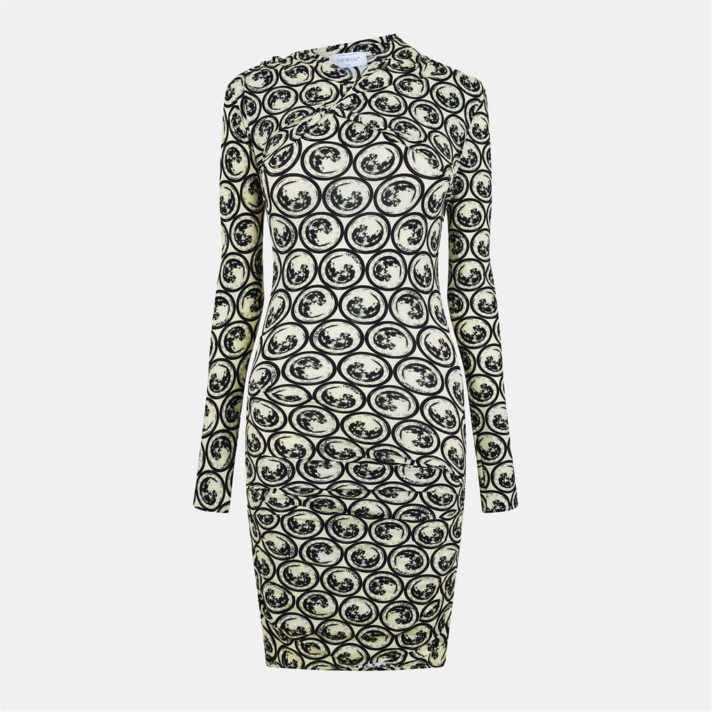 This Off White mini dress features a bodycon style with a slim fit, perfect for making a statement. The dress showcases a graphic print and a twist effect, adding a unique touch to its design. It has a crew neck and a straight hem, offering a sleek and modern look. -
