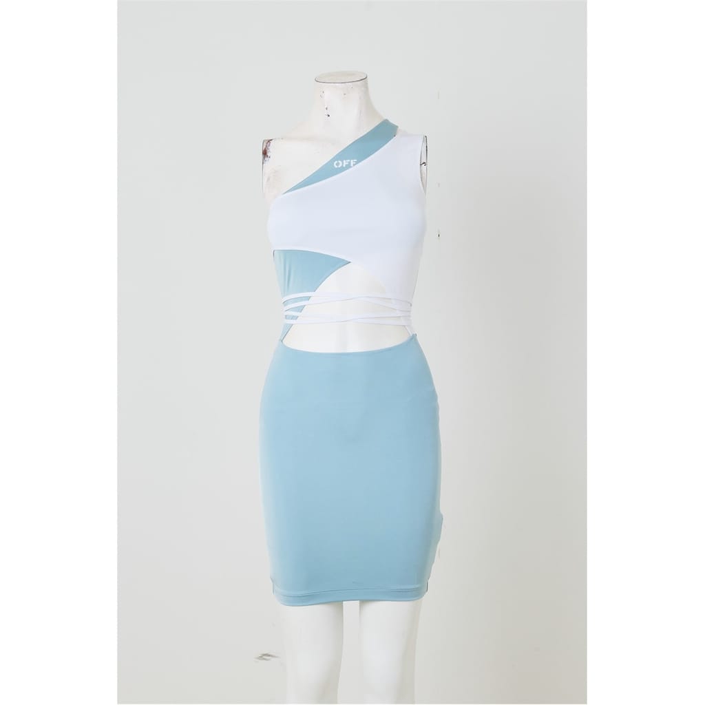 This Off White mini bodycon dress features a striking one-shoulder neckline and spaghetti straps, creating a sleek silhouette. The dress is adorned with cut-out embellishments and a bold color block pattern, complemented by lettering graphics. Its slim fit and straight hemline enhance its modern appeal, making it a standout piece for any occasion. -