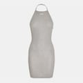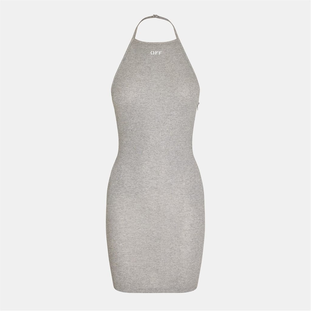 This Off White mini bodycon dress features a halter neck and spaghetti straps, offering a sleek and modern look. The ribbed pattern adds texture, while the straight hem and slim fit ensure a flattering silhouette. A subtle logo embellishment completes the design, making it a stylish choice for any occasion. -