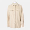 This Off White top features a solid pattern with long sleeves and a regular fit. It is adorned with a logo and pocket embellishments, adding a touch of style. The top includes a button closure and a point collar, making it a versatile choice for casual collections. The cuff sleeves enhance its overall design, offering a modern and sophisticated look. -
