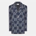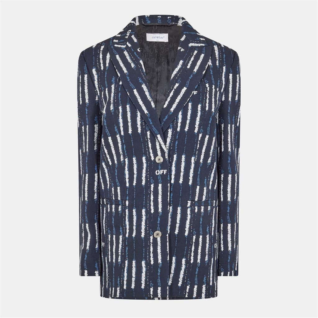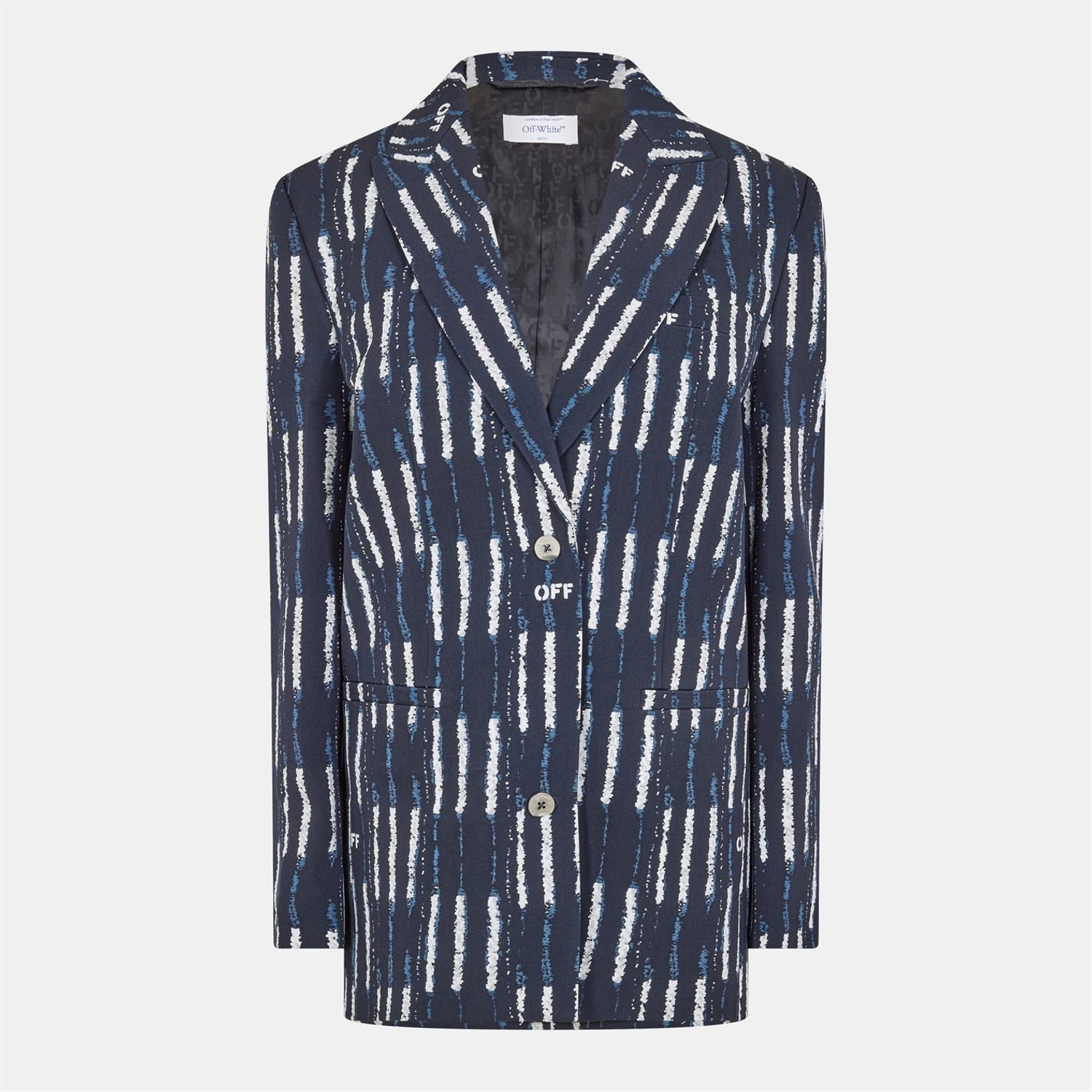 This Off-White suit jacket from the casual collection features a lapel collar and a button closure. It showcases a regular fit with a straight hem and a distinctive vertical stripe pattern. The jacket is embellished with a logo, adding a touch of brand identity. -