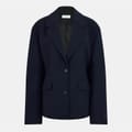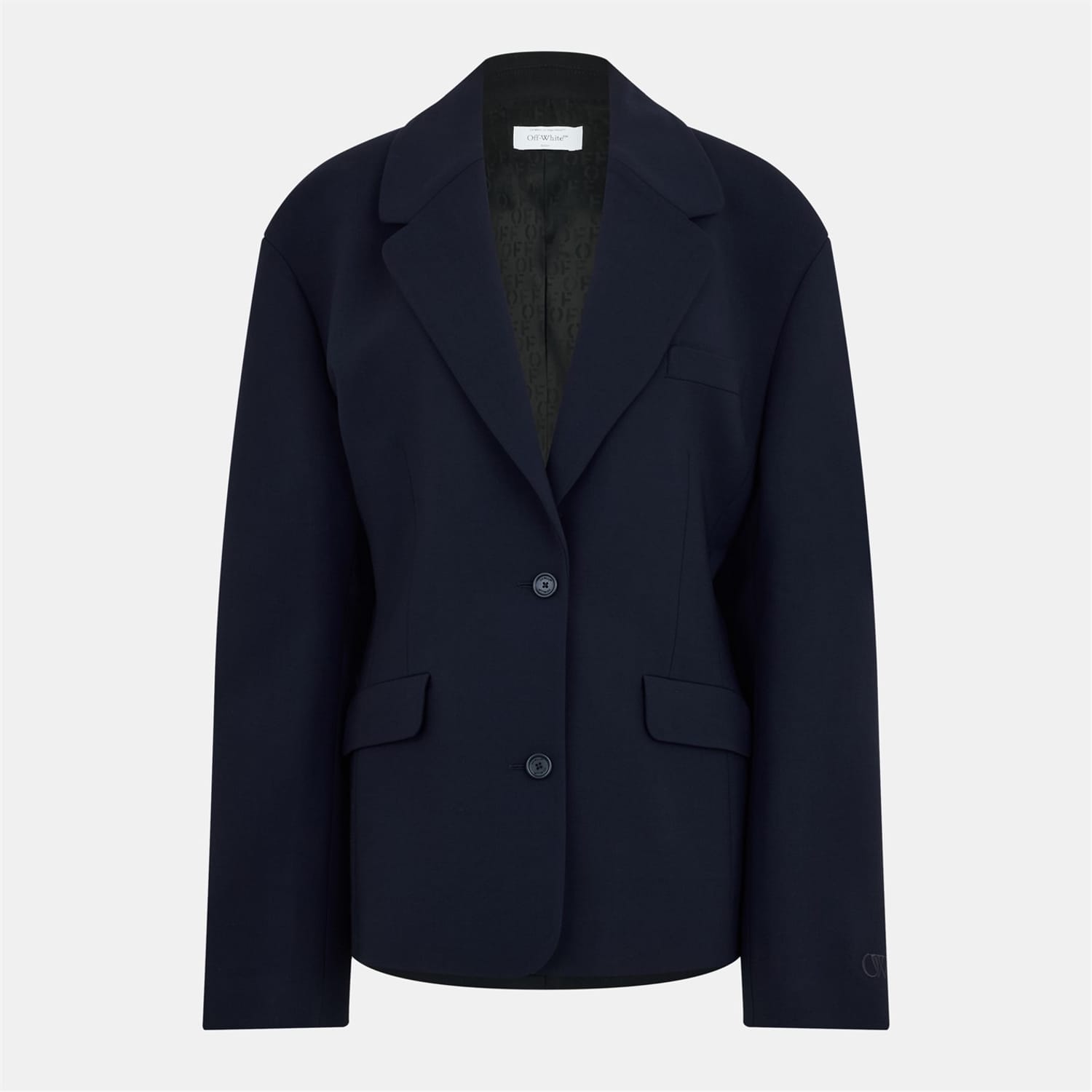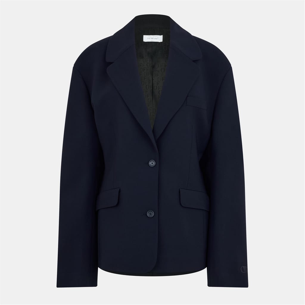 This Off-White suit jacket features a lapel collar and a straight hem, offering a regular fit. The solid pattern is complemented by a button closure, while the logo embellishment adds a distinctive touch. -