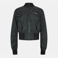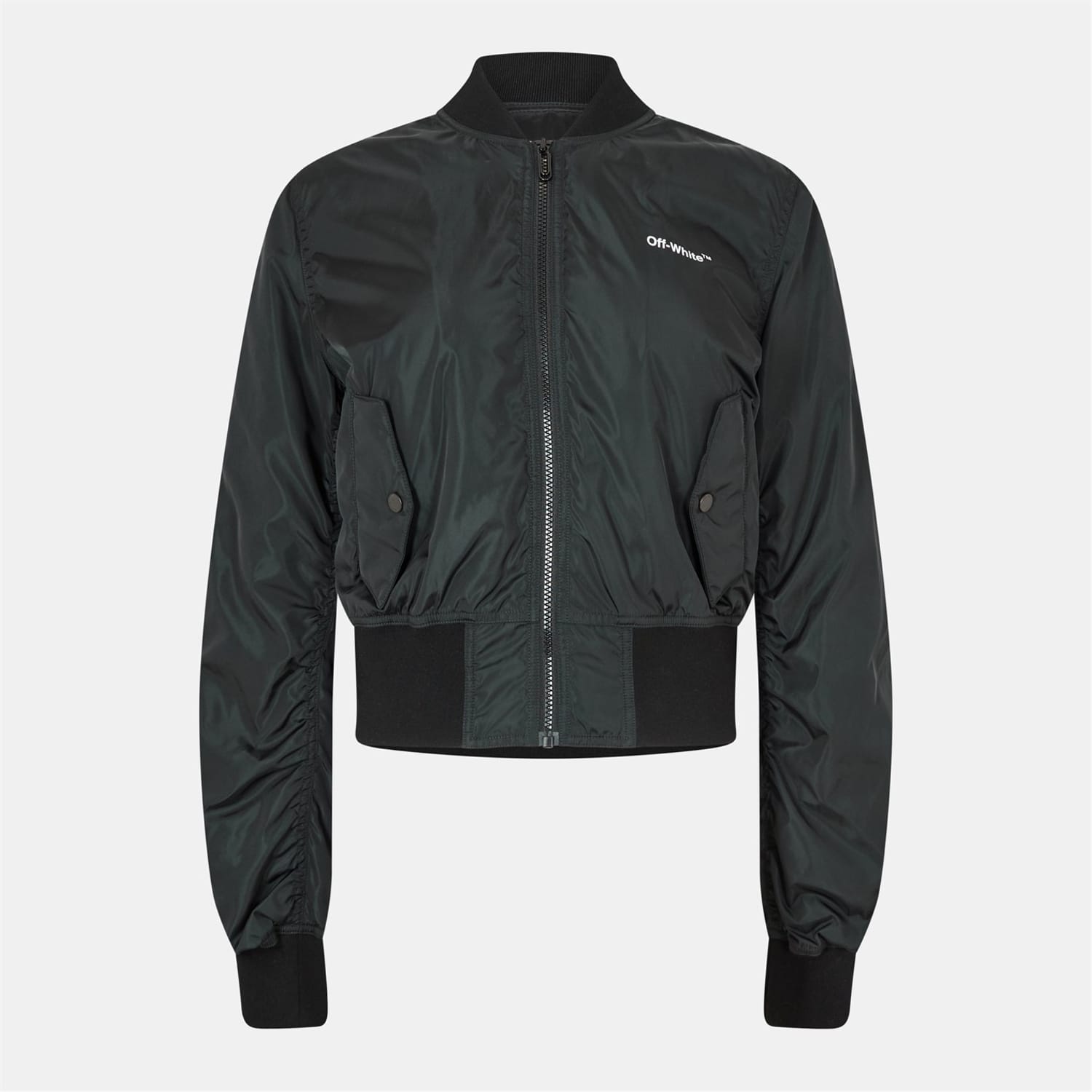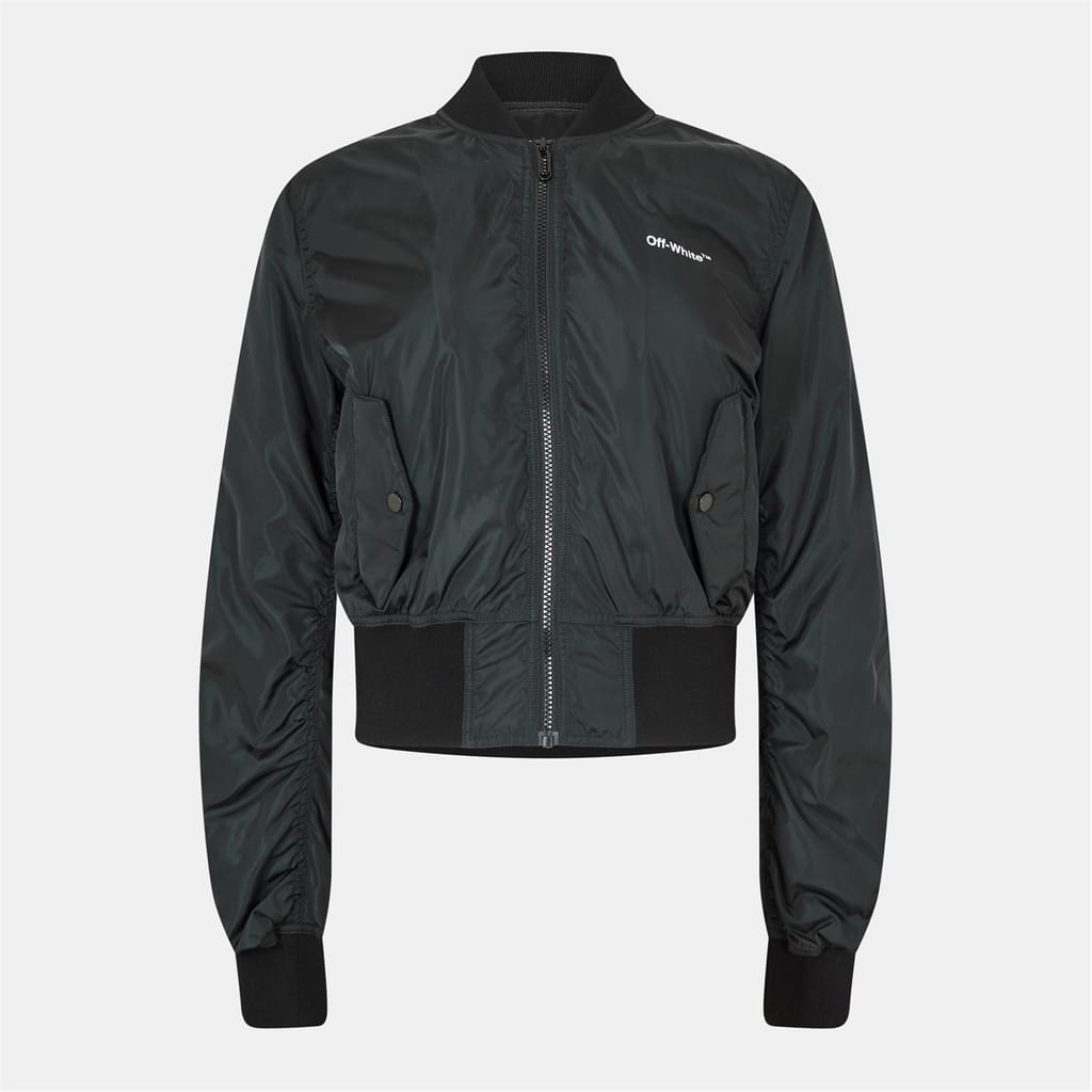This Off-White bomber jacket features a short length and a bomber collar, offering a classic silhouette. The jacket is designed with a solid pattern and includes a zipper closure for convenience. It has a regular fit, complemented by ribbed cuffs and hem. The jacket is embellished with the brand's logo and lettering, adding a distinctive touch to its design. -
