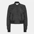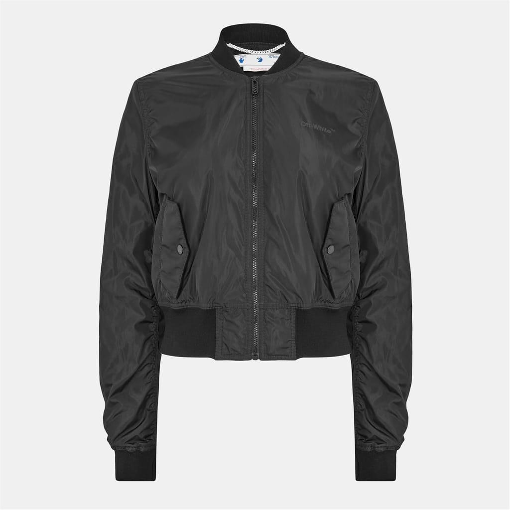 This Off-White bomber jacket is a casual staple with a short length and regular fit. It features a ribbed crew neck, bomber collar, and ribbed cuffs and hem for a classic look. The solid pattern is complemented by a logo embellishment, while the zipper closure ensures practicality. -