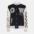 This Off-White bomber jacket features a short length and a bomber collar, offering a classic silhouette. The jacket is designed with a ribbed crew neck, ribbed cuffs, and a ribbed hem for a snug fit. It includes a snap button closure and zipper for versatile styling. The solid pattern is enhanced with embroidered logo embellishments and distinctive lettering graphics, creating a unique look. -