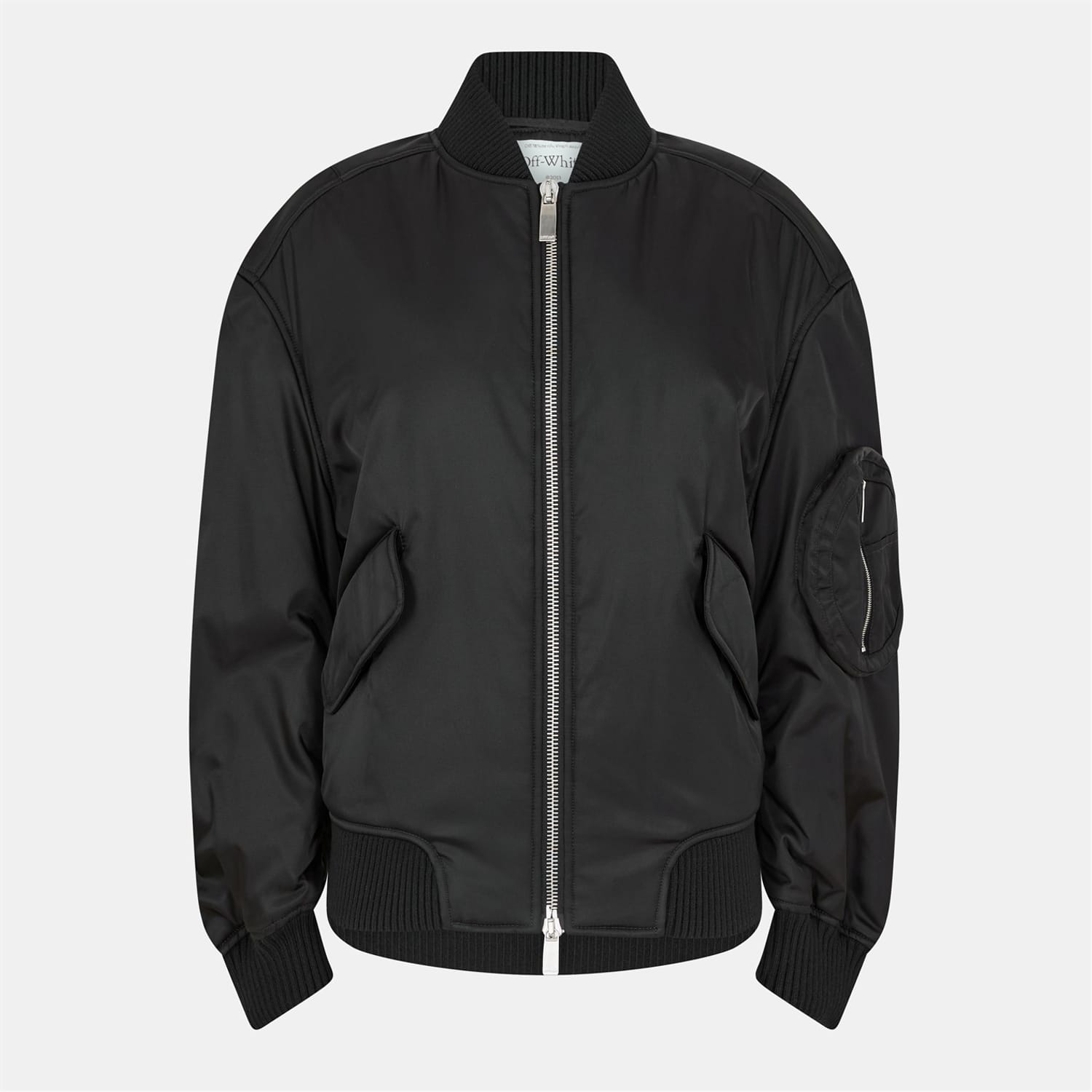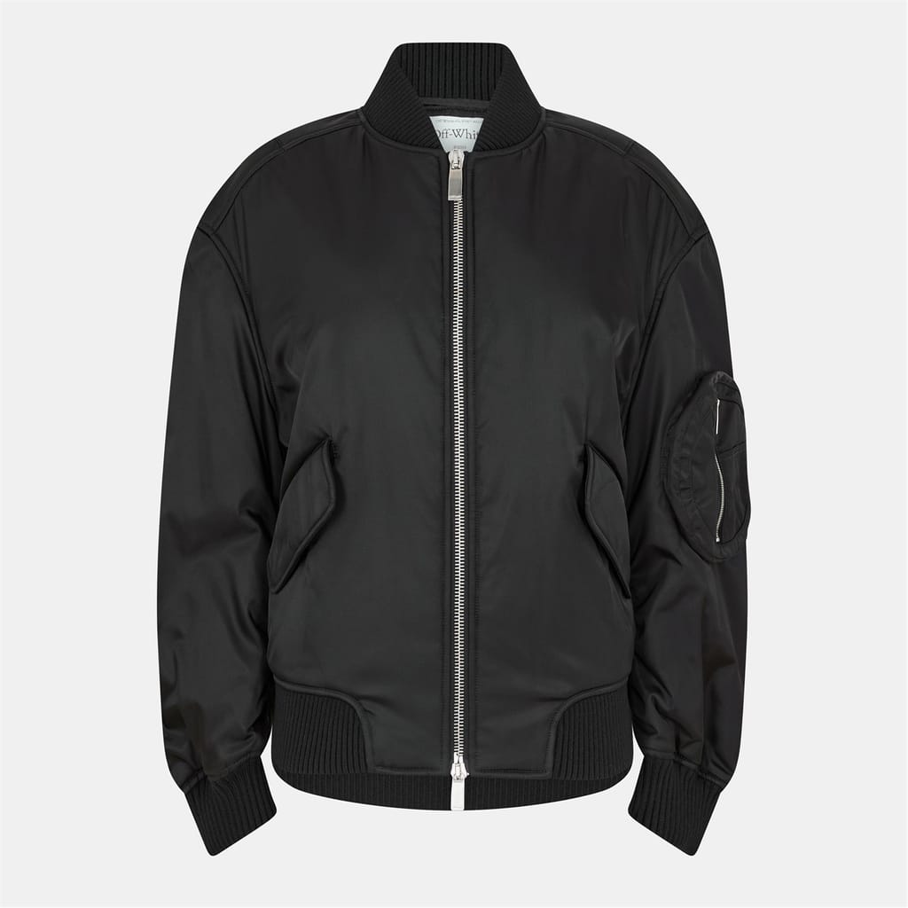 This Off-White bomber jacket features a short length and a relaxed fit, perfect for a casual look. It comes with a ribbed crew neck, bomber collar, and ribbed hem, adding to its classic style. The jacket is equipped with a zipper closure and includes practical embellishments such as pockets, zipped pockets, and a sleeve pocket. The solid pattern and ribbed cuffs complete the design. -