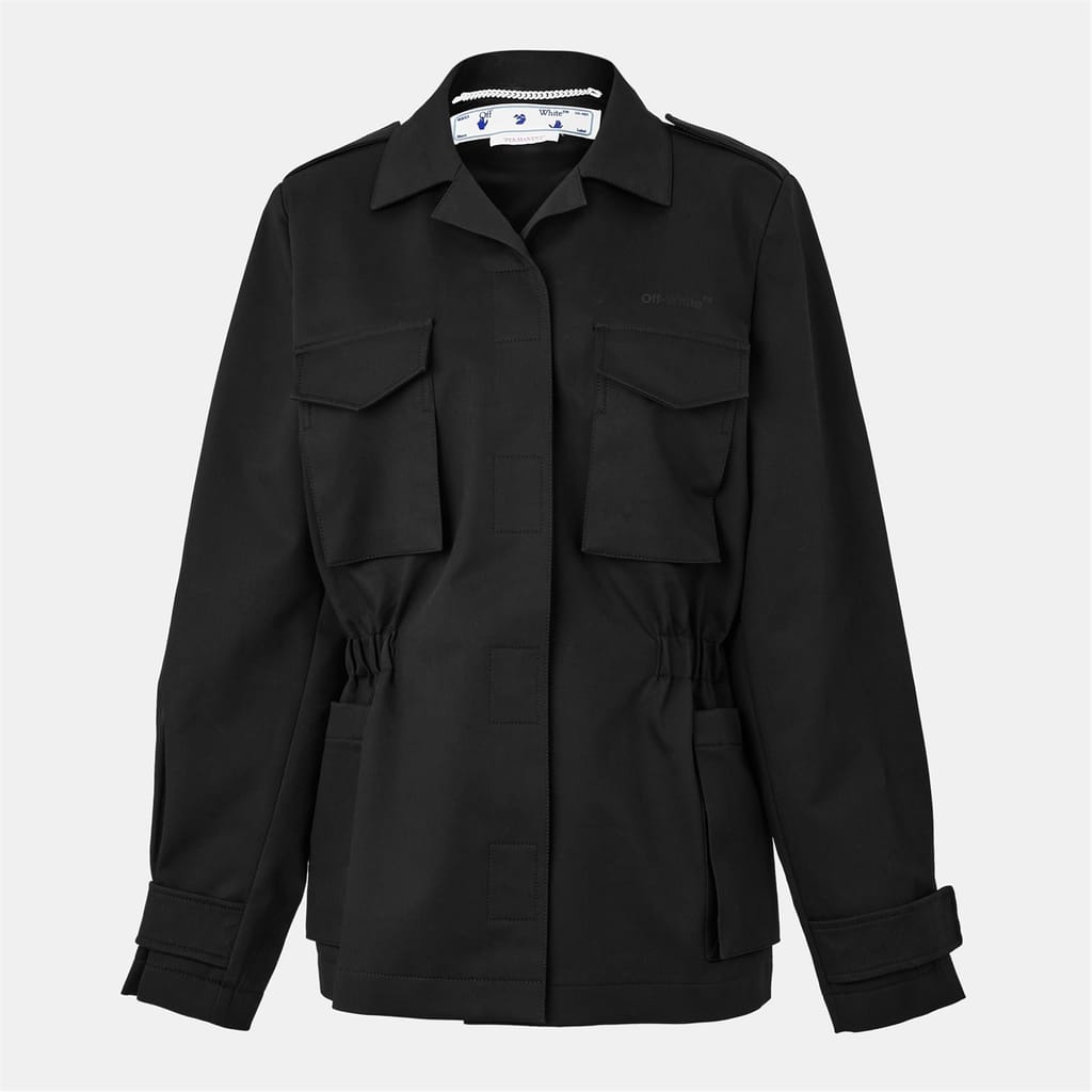 This Off-White field jacket features a relaxed fit with a solid pattern. It is designed with a shirt collar and a straight hem. The jacket includes a button closure and is adorned with a logo and pockets. The roll-up cuff sleeves add a practical touch to this stylish piece. -
