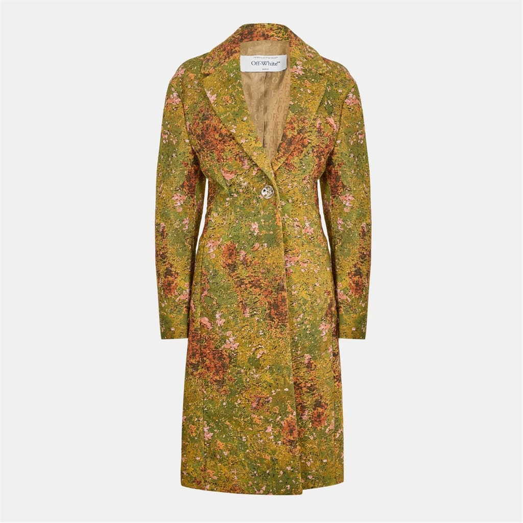 This Off-White overcoat is perfect for winter, featuring a lapel collar and a straight hem. The regular fit ensures comfort, while the button closure adds a classic touch. Adorned with a floral pattern and a subtle logo embellishment, this coat combines style and functionality seamlessly. -