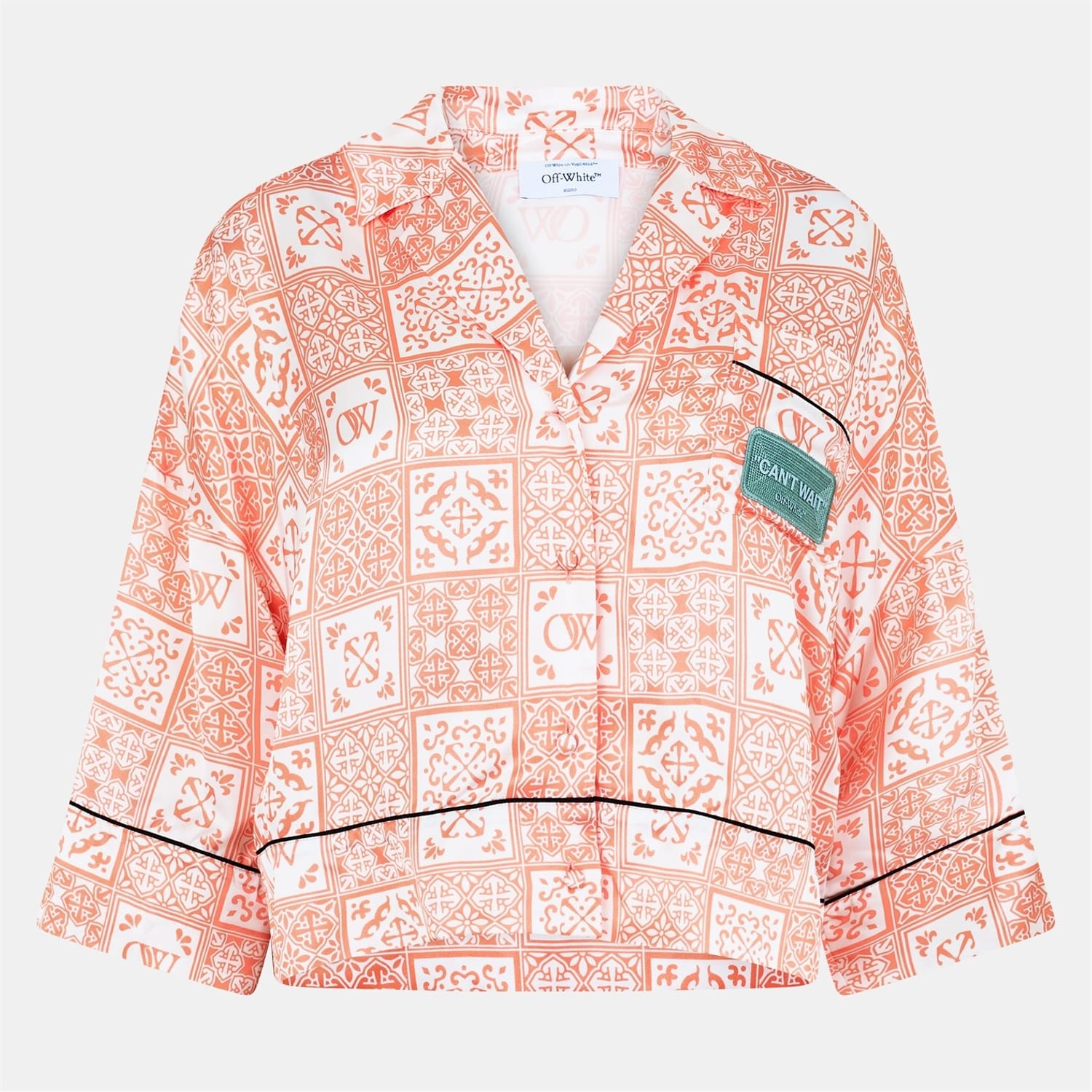 This Off White top features a relaxed fit with a geometric pattern, perfect for casual collections. The three-quarter sleeves and button-down closure add a touch of sophistication. Embellished with a distinctive patch and logo, this top is a stylish choice for any wardrobe. -