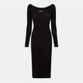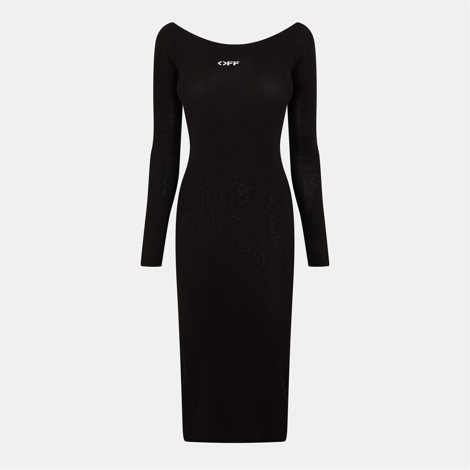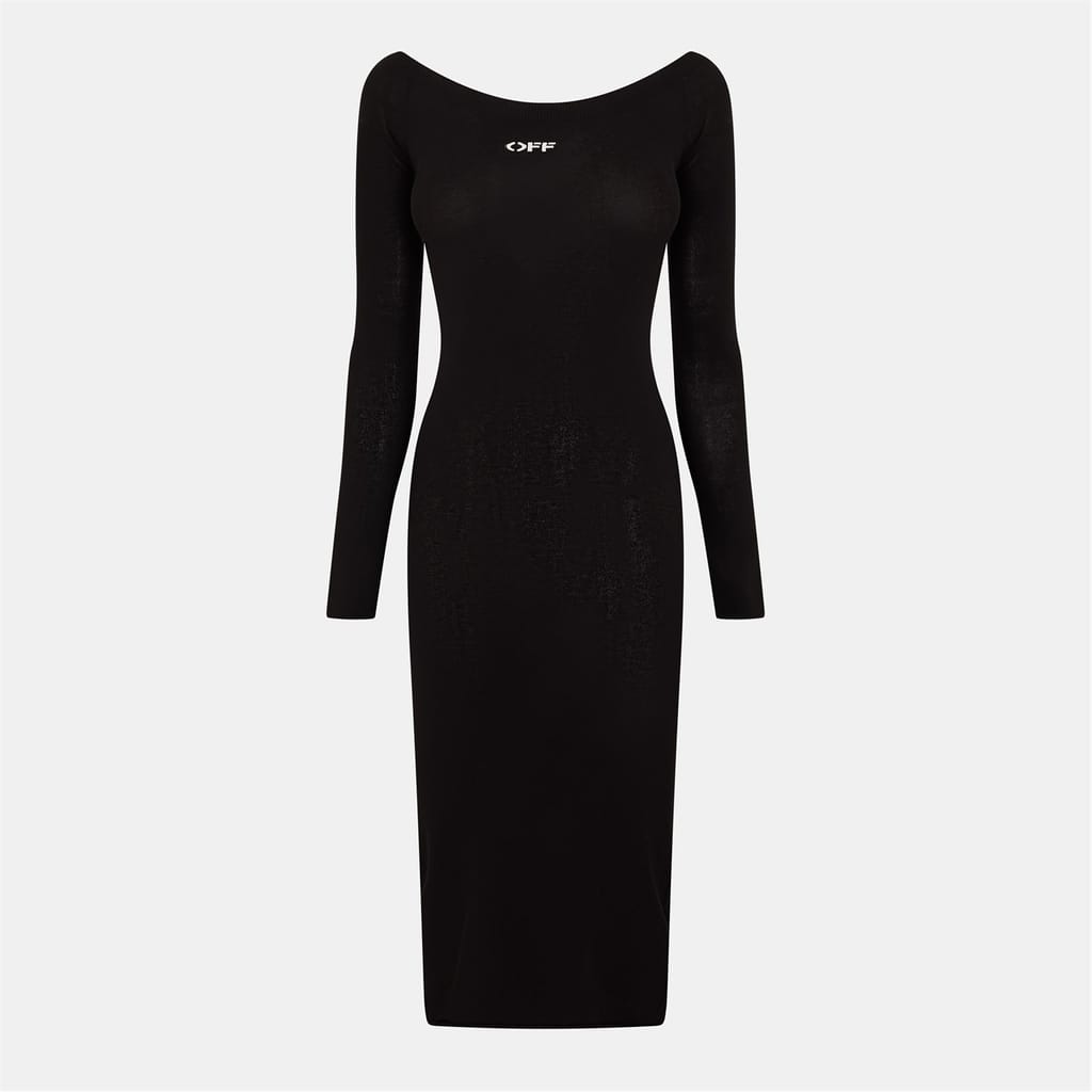 This Off White maxi dress features a scoop neckline and a straight hem, crafted in a solid pattern. The bodycon style offers a slim fit, accentuating the silhouette. The dress is adorned with a subtle logo embellishment, adding a touch of brand identity. -