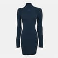 Off White mini bodycon dress features a high neck and long sleeves, offering a sleek and slim fit. The solid pattern is complemented by a straight hem, while the brand's logo adds a distinctive touch. -
