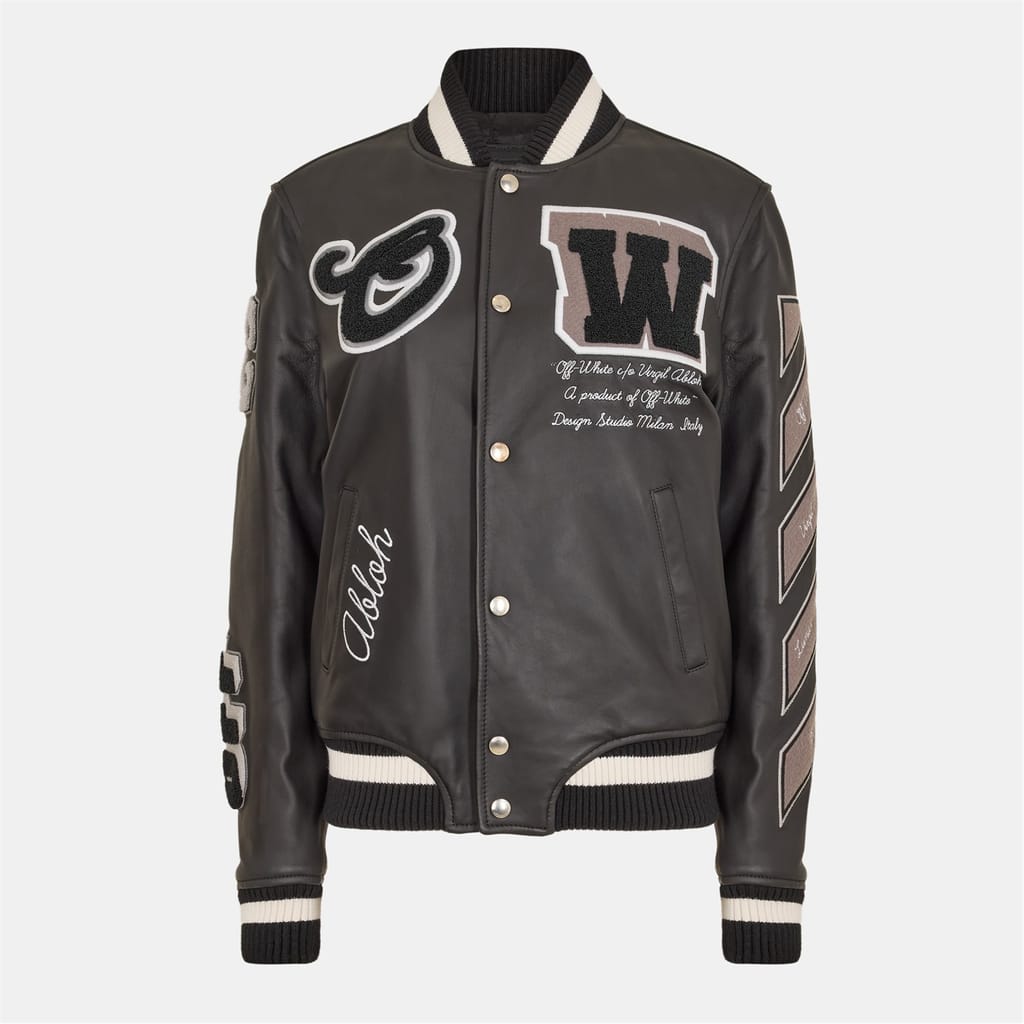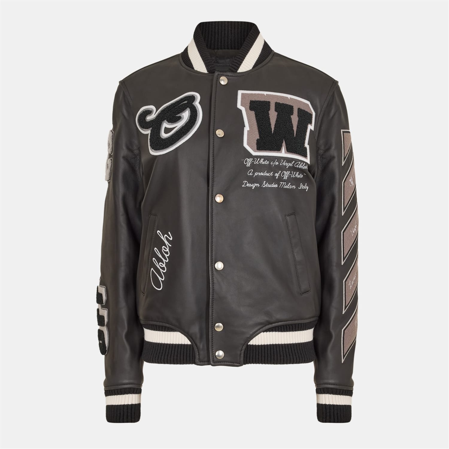 The Off-White Moon varsity jacket features a bomber collar and a snap button closure. It showcases a regular fit with ribbed cuffs and hem. The solid pattern is enhanced with embroidered lettering, applique, and logo embellishments. Patch pockets add functionality to this stylish piece. -