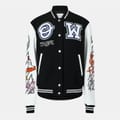 This Off-White varsity jacket features a ribbed crew neck and raglan sleeves, offering a comfortable regular fit. The snap button closure adds a classic touch, while the ribbed collar, cuffs, and hemline ensure a snug fit. Embellished with a logo, patch, and embroidery, it showcases a large genie graphic on a solid pattern, making it a standout piece. -
